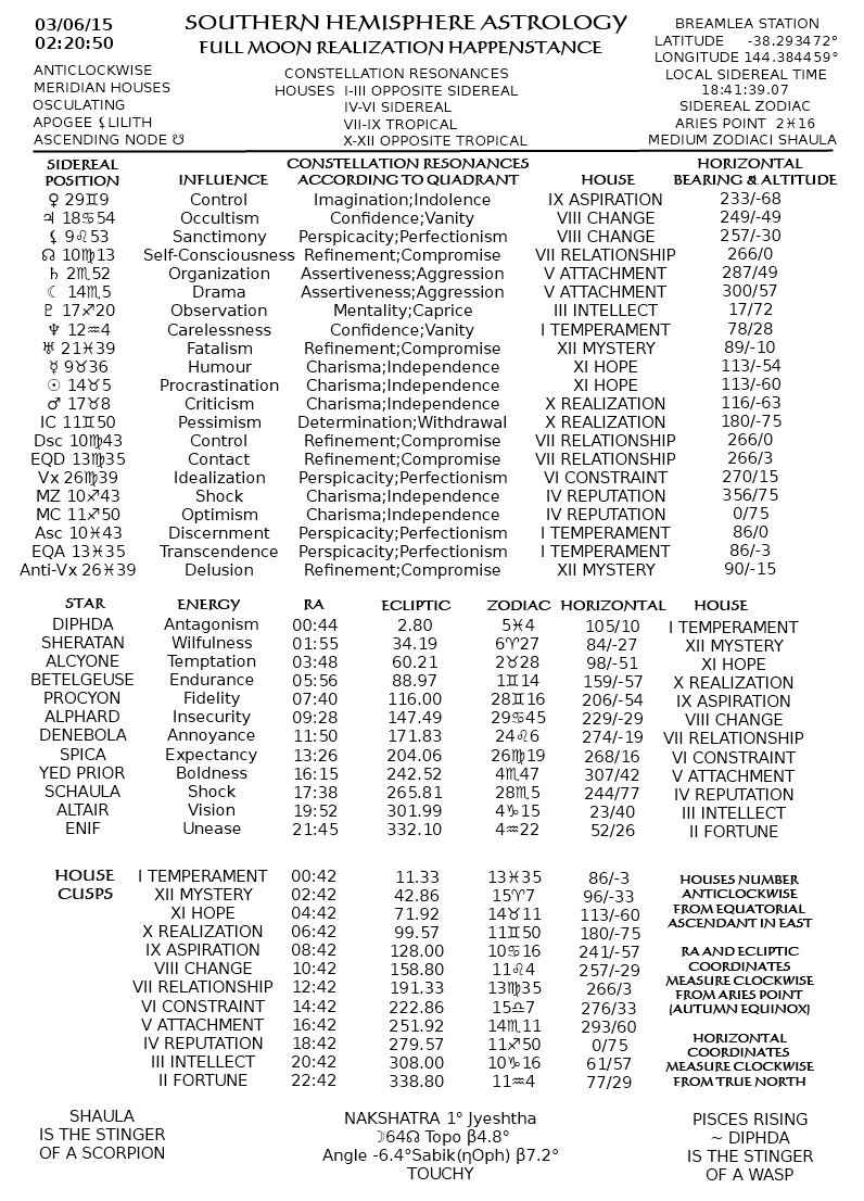 This is the basis for my exploration of the resonance of the orientation of the zodiac. If its arc is crowning to the west when I am oriented to the meridian, a different significance imposes itself than what I feel if I have to slew east. The secret I have discovered out of the corner of my eye in this regard is that the stars of the zodiac and its background have a different weight according to whether they are west or east around the crown of the zodiac arc.