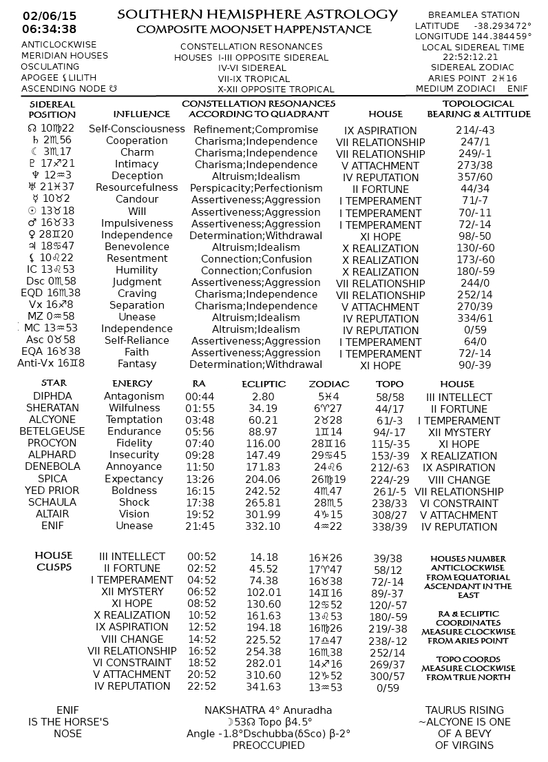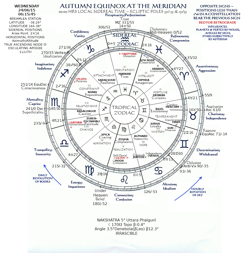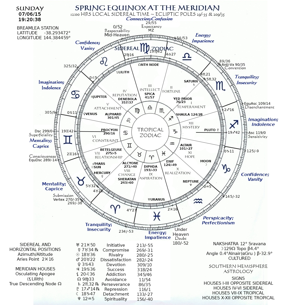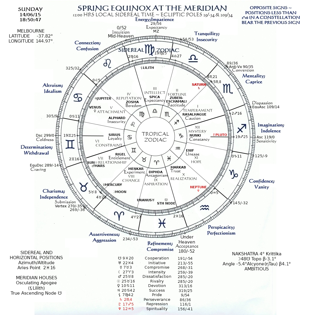 There is one other phenomenon to tax you with, if you have read to here, and it occurs as Sagittarius tops the arc and then crosses the meridian. At all other times the background stars to the high point of the ecliptic follow each other in succession as they move westward, but at the summer solstice point the midpoint of the zodiac arch moves from third to fourth house, and we couldn’t allow the highest point to trail its marker star behind in a different house, could we?