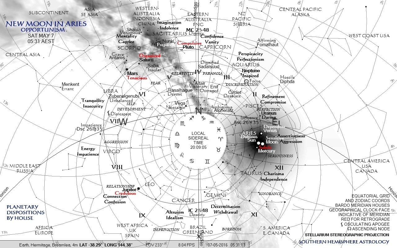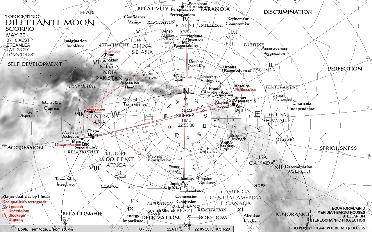 In these terms, and from a southern hemisphere tropical perspective, the Moon has been mulling over the moral implications of opportunity since its conjunction in Aries with a strong-willed Sun inspired by assertiveness, tending unfortunately to aggression, according to the character of northern hemisphere natives born in early winter. How might the Moon in Scorpio, dipping below the western horizon in the seventh house, especially now that his reflection is of an ego which has moved on into a semblance of mastery in close-quarters winter interaction, synthesize those implications?