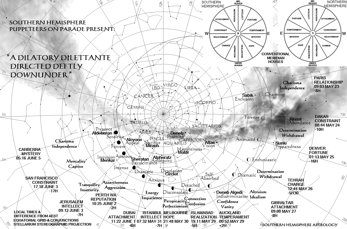 I have to say that I cherish local perspective, even when it’s the dark interior of a hole in the ground. I came to astrology as a stargazer, and the algorithms of Southern Hemisphere Astrology evolved out of years researching celestial mechanics. The adherence ‘downunder’ to historical northern hemisphere interpretations of the Moon’s nodes (the draconic month)–appearances are downside up in the south–was merely the bait. My abiding intention is to encourage my grandchildren and you to go outside and have a look. I hope once in a lifetime you will stay at least half an hour to experience sky movement.