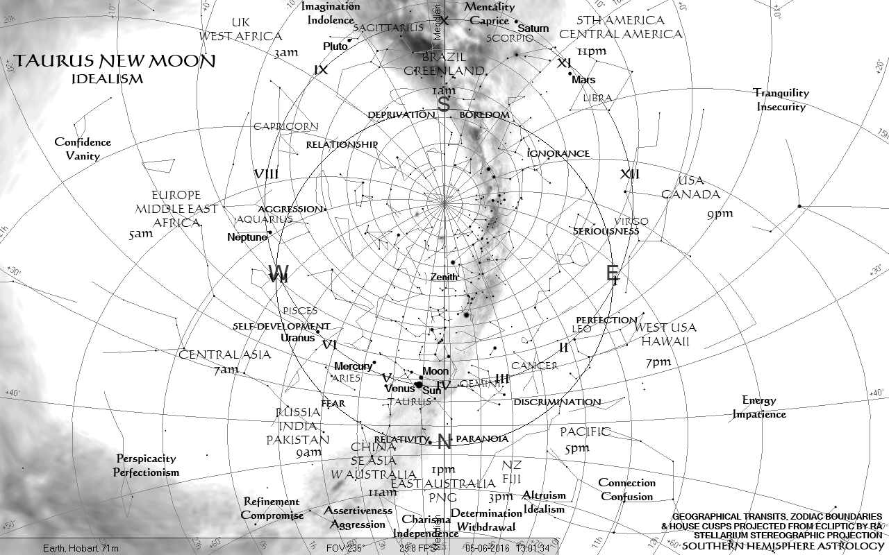 Out of respect for our northern cousins, i.e. those living north of 23.44 degrees north latitude, I present the view from the ‘Mirror’ just off the east coast of Japan, the same distance ‘above’ the equator as Melbourne is ‘below’ it, and at the same longitude. Let me remind all readers that you can always see the opposite hemisphere’s point of view if you turn to the cardinal point opposite the Medium Coeli, cusp of the Fourth House, and crane your neck backwards far enough!