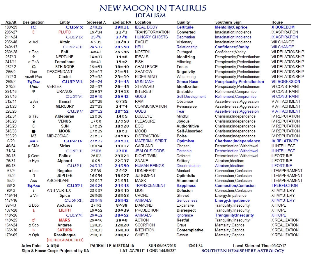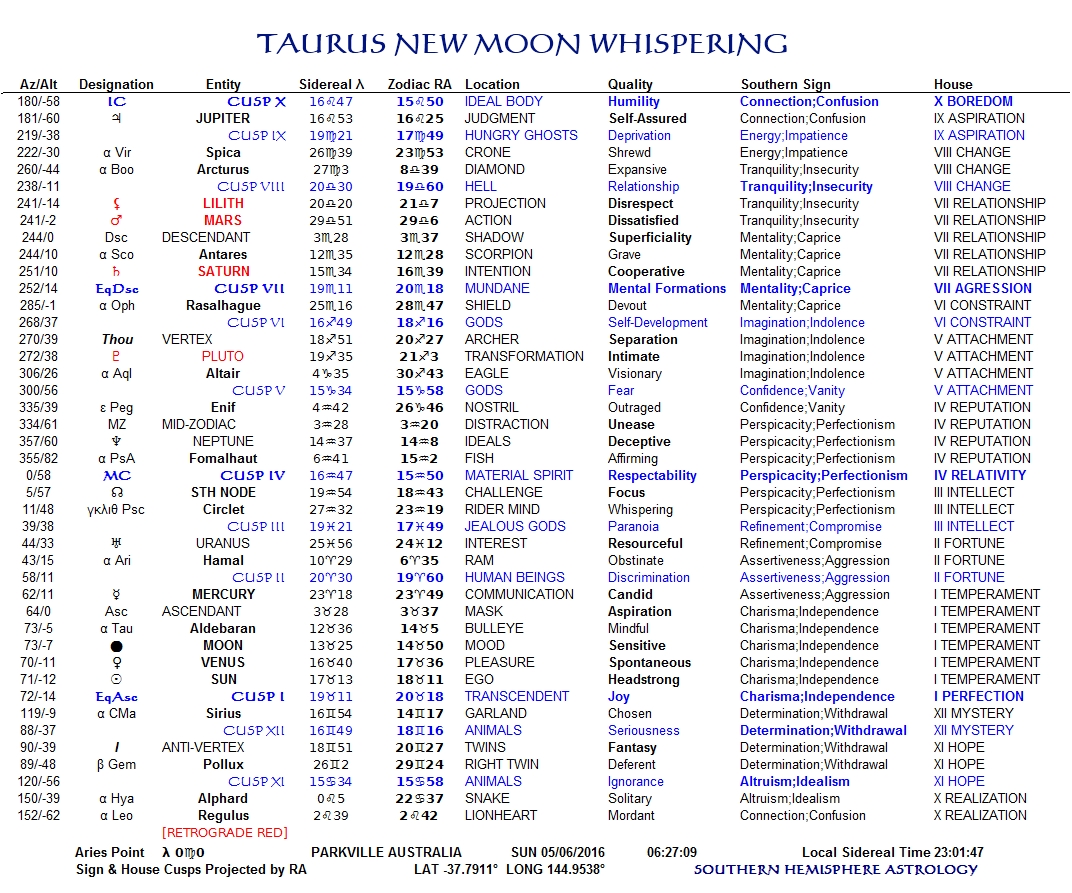 The Full Moon this month as you can see is half an arc-minute from the solstice of the Tropic of Cancer, so it is more than valid to look at it from a southern astrological perspective. The one-half of the world’s population who live below the Tropic of Cancer are looking north to see the Moon, so it appears 104 degrees past the descending node! Most of you will go, “Huh?”, but in the interests of the ‘silent majority’ I would like to remind you that Southern Hemisphere Astrology evolved as a rejection of colonialism! Our perspective ‘down’ here is as relevant as yours ‘up’ there, and perhaps the polarities of astrology can resonate with the ‘silent majority’ after all.