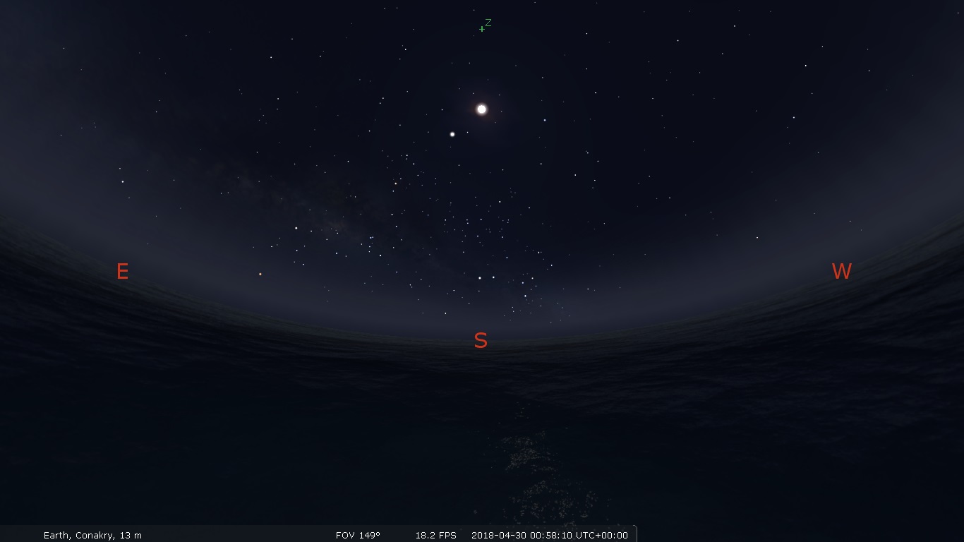 Looking south past the Pepper Coast above the South Atlantic Ocean, this is the view at the moment of Full Moon an hour after midnight: a sensual delight for the average person, perhaps signifying nothing, but more fancifully, a portentous conjunction of Moon and Jupiter above an horizon glistening with the reflection of riotous fires in the eyes of bewildered children.
