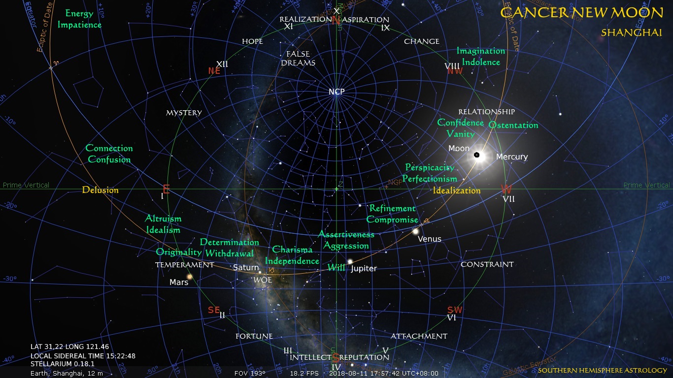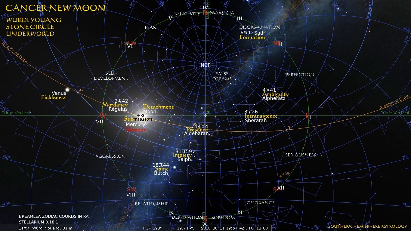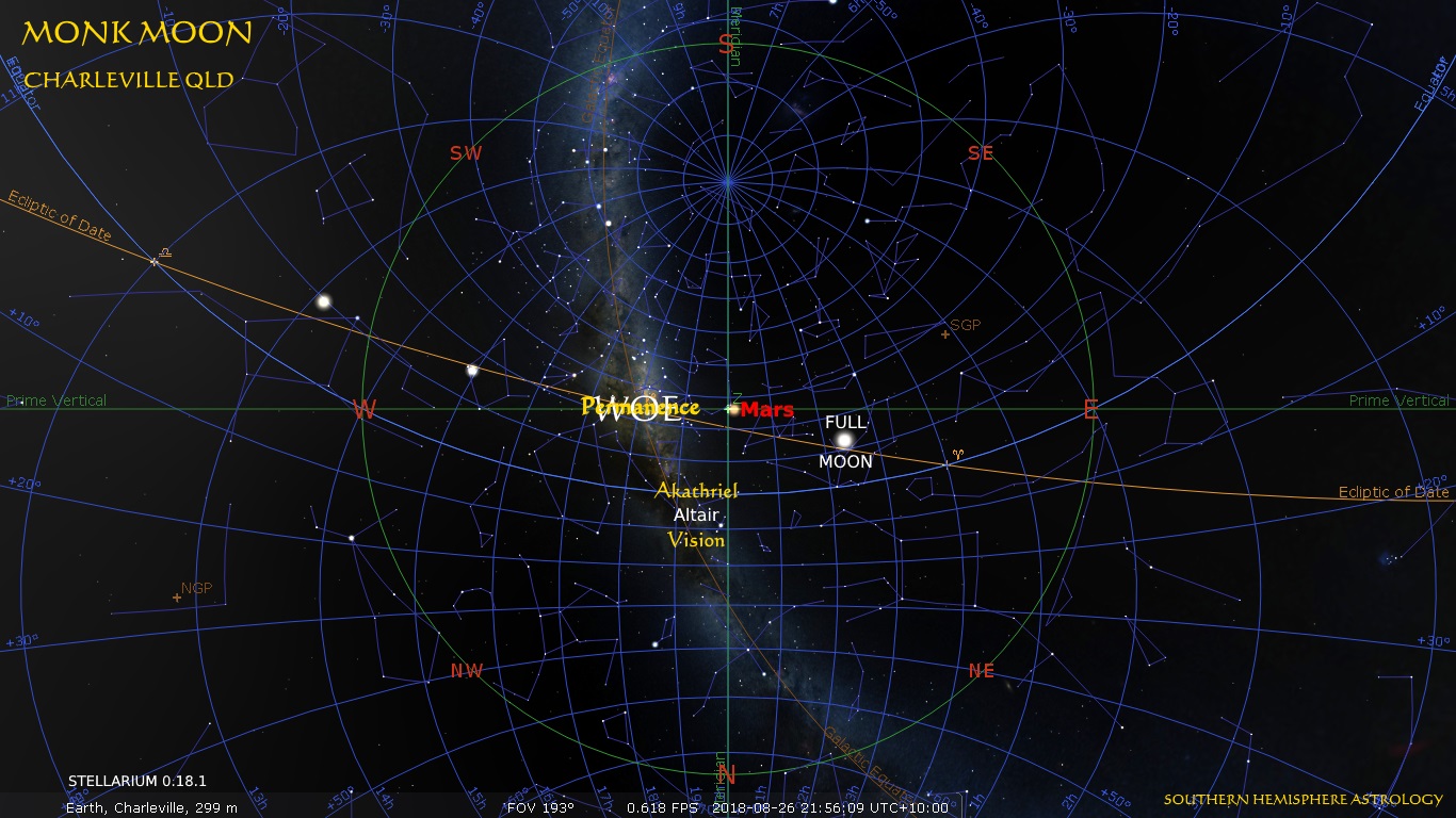 Like any map, the stereographic whole-horizon projection can be difficult to orientate. You need only keep in mind that the Earth rotates to the east–that is the very definition of East–then you will instantly see that the stars appear to revolve clockwise around the South Celestial Pole, and anti-clockwise around the North Celestial Pole, unless it’s not the sky’s face we’re looking at, but its body. Look up, and you see the face; look down, at a map of your sky, or through the ground at your Underworld, and you see the body. Furthermore, your face is at the bottom of the chart, and everything over the Prime Meridian is projected upside-down. Tilt your face back far enough from the daytime direction of the Sun and imagine what is going on behind you as the experience of a night sky on the other side. Don’t get it? Perhaps your gamma wave needs some work?