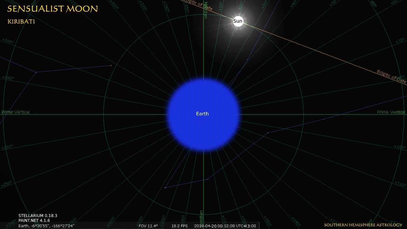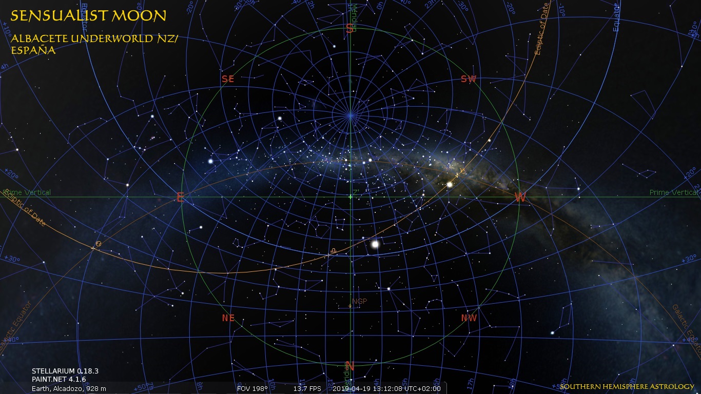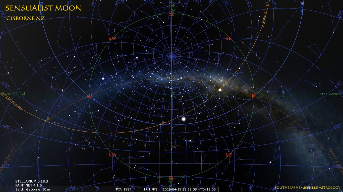None of this self-discovery business needs to be anxious, dear reader, even in the event that it is not merely incidental that we are at Easter once again and throngs of candles will soon be wending their way through the nightscapes of Christian cities. To take part in such a procession is not usually the privilege of the sensualist, but he is nevertheless bedazzled by the extraordinary synchronicity of the annual procession and midnight transits of the Easter Moon and the Southern Cross. Have candle holders never wondered about the night sky which grounded the followers of Jesus after their prophet’s martyrdom? What were they staring at, indeed, when tomorrow became today? The one thing you cannot hide from the senses is meaning! But hark, the sensualist is not gawping at the Moon, but in the opposite direction, and the Moon’s gaze is boring through the back of his head, or would be, if the Moon and sensualist were not one and the same. The sensualist’s art is the transparency of walls. Is the Full Moon in Libra or Virgo? Take your pick.