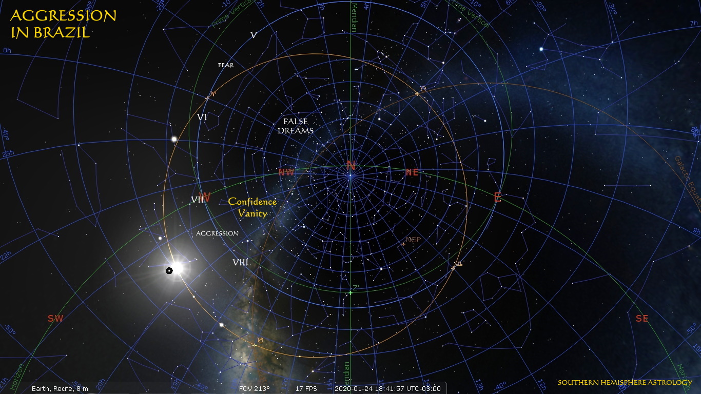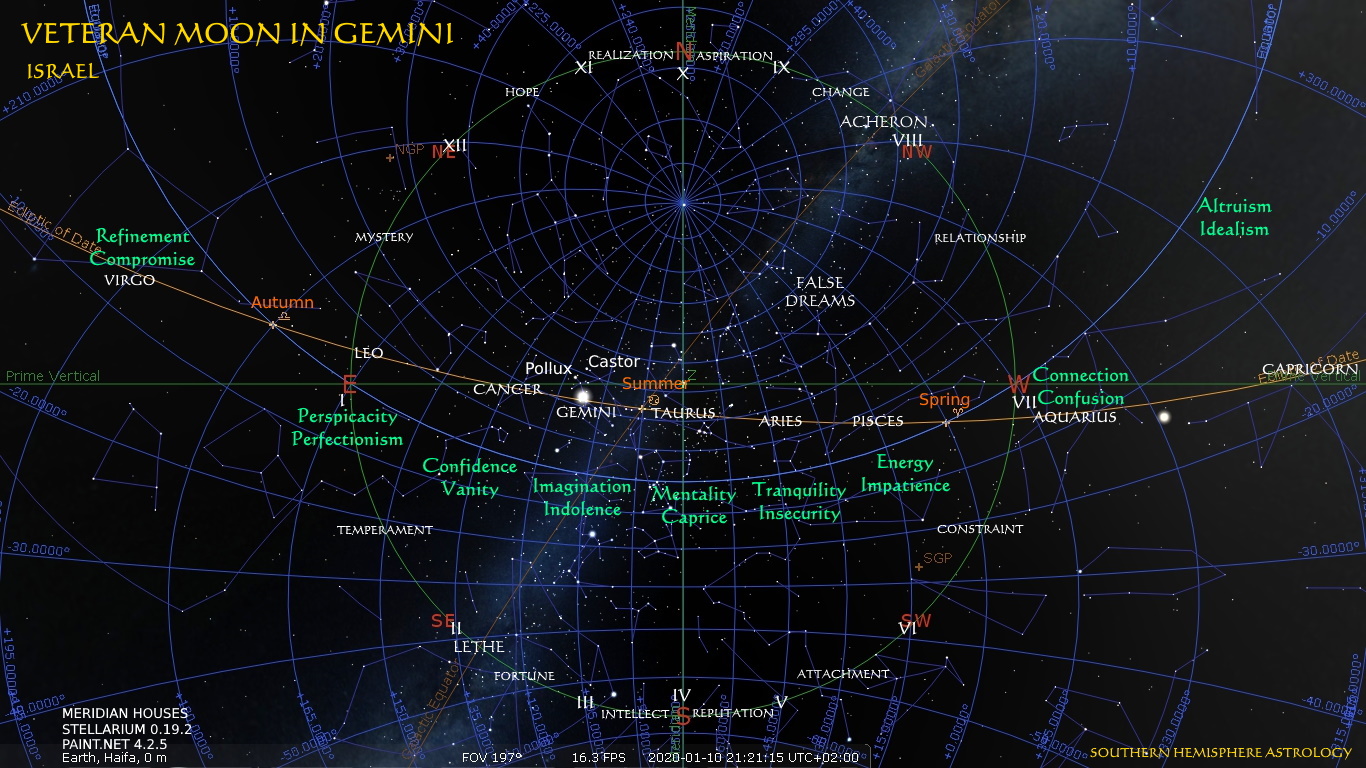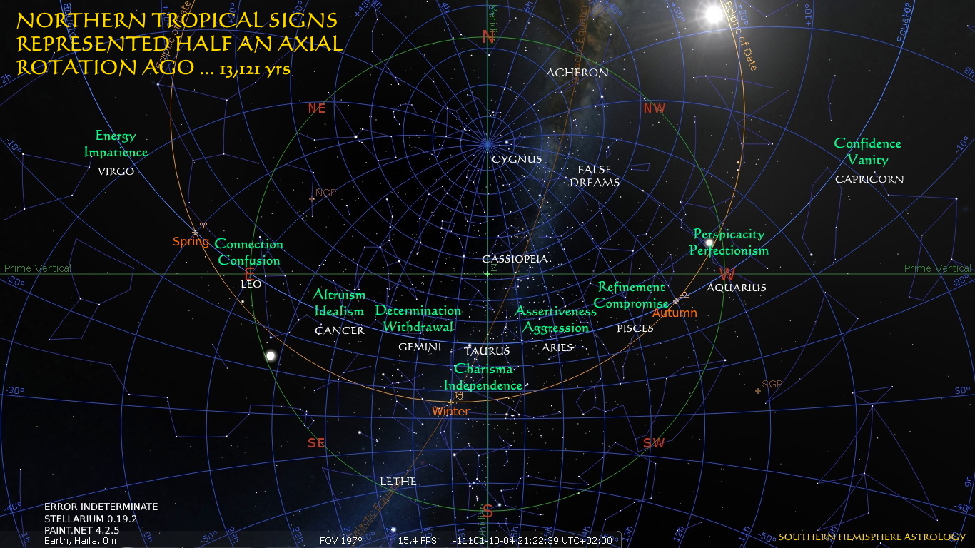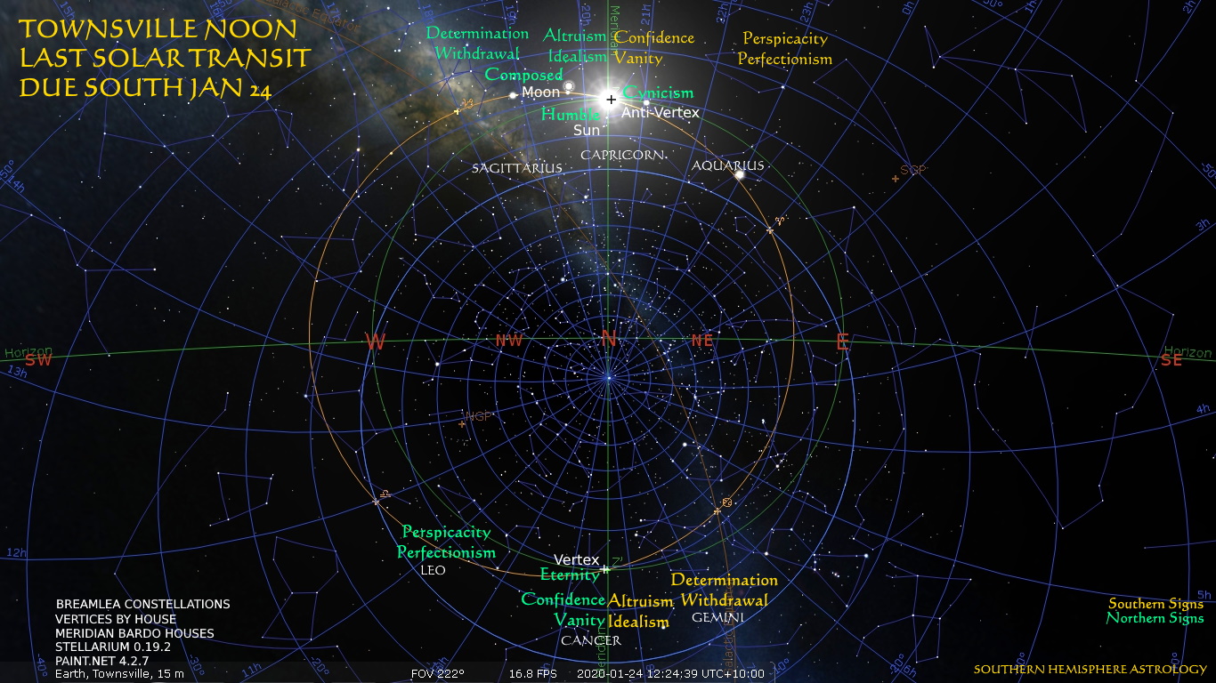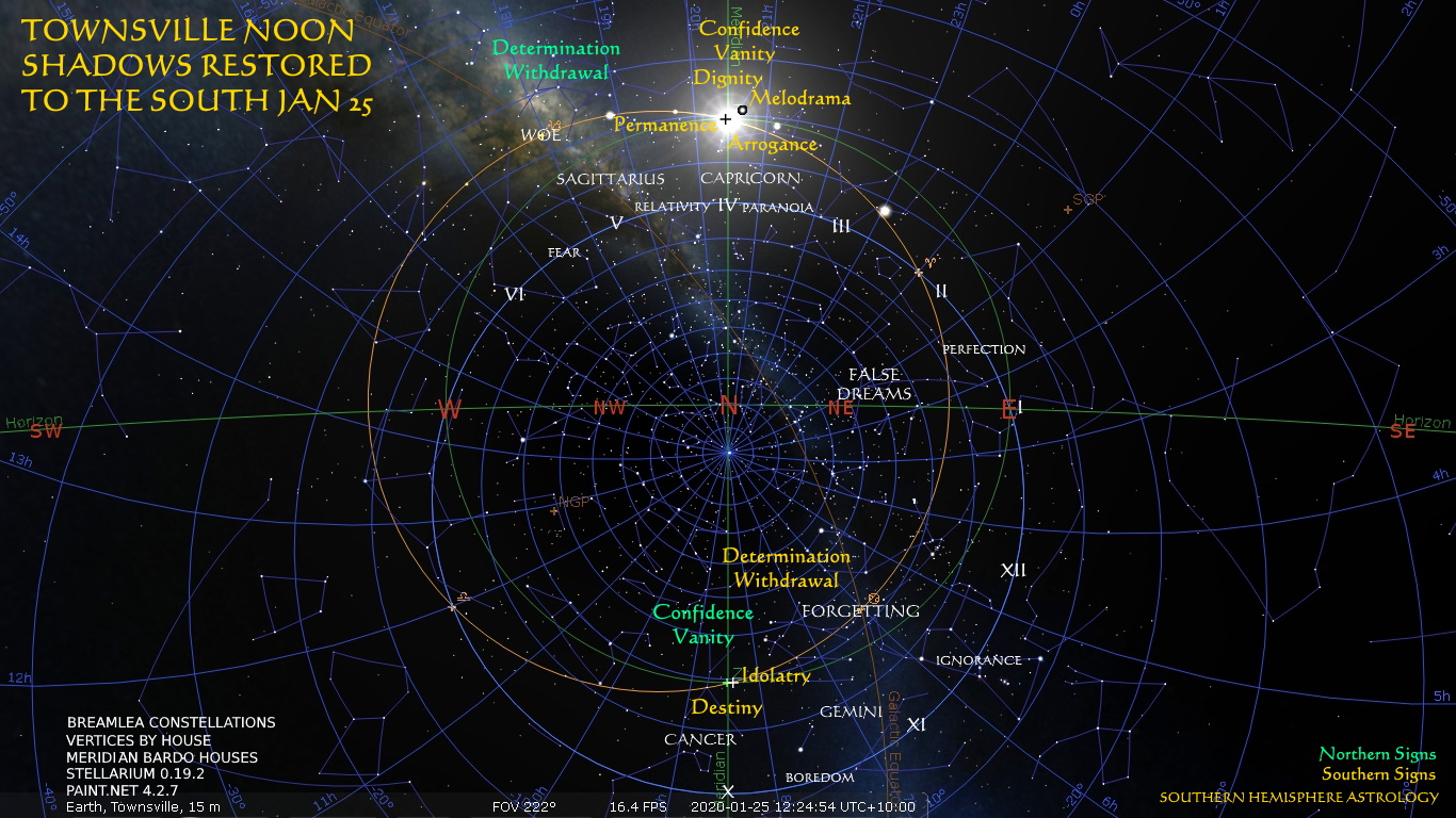Today is an important day in Townsville, Australia. Locations south of Toolakea witness their noonday shadows to their south for the first time since the Sun’s declination moved south of Townsville’s latitude on 19 November. In astrological terms, the noon Vertex moves from the 9th House to the 4th, or in simple geometrical terms, the overhead intersection of the Ecliptic with the Prime Vertical crosses from the east to the west, transformed from anti-Vertex to Vertex. Another way to relate to this phenomenon is to imagine the complete reorientation of your sense of direction when the Sun goes from rising on your left to rising on your right, how mindful of your shadow you would need to be in terrain with no landmarks, and how familiar with landmarks you would need to be in the tropics. You would expect our ancestors in the tropics to travel a lot at night and know the stars like the back of their hands, wouldn’t you?