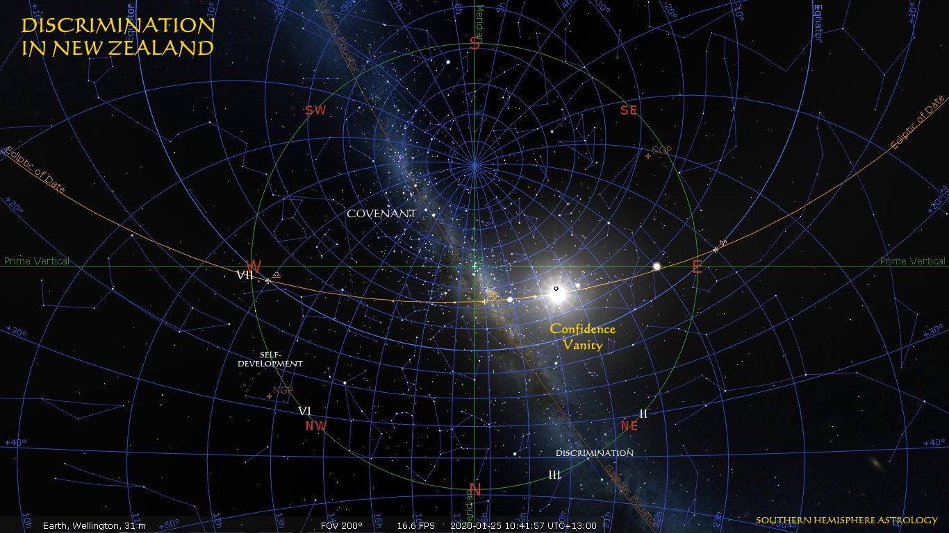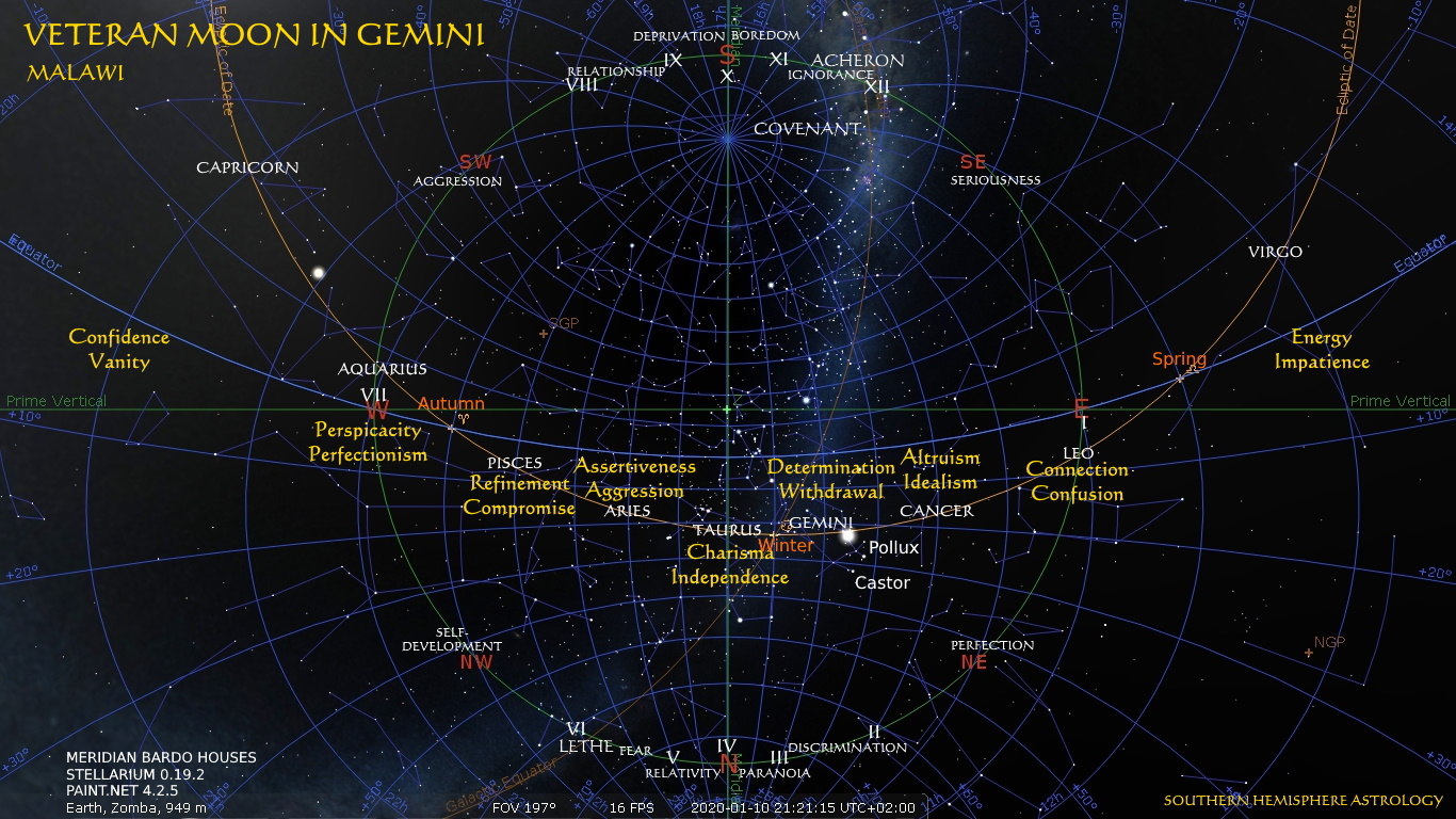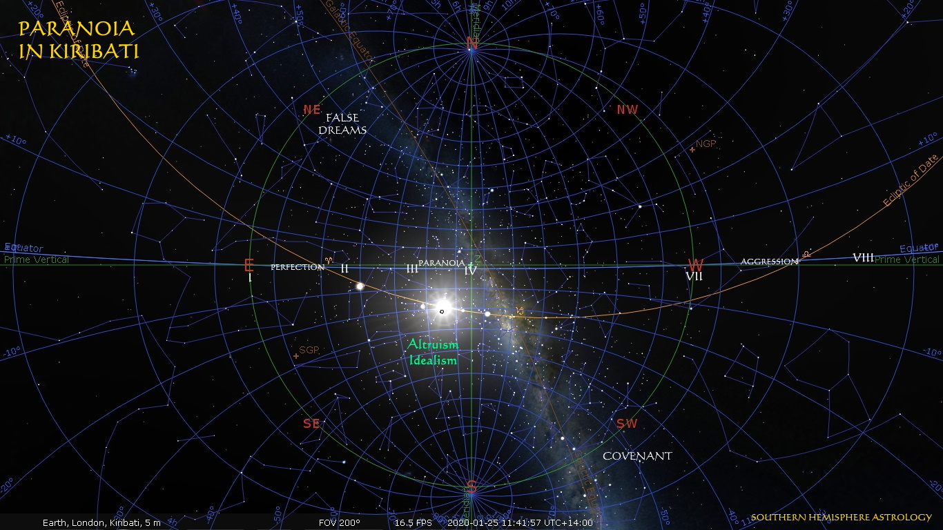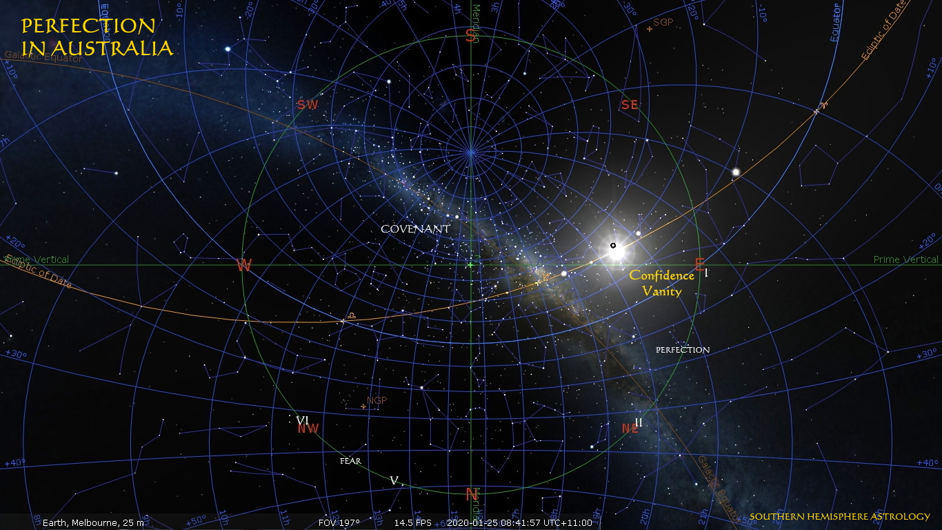 Let’s whizz to the moment in time, several hours before Townsville noon, customarily identified by the Academy of Scientific Astrology and the Uniting Church of Oncology, Climatology, Astrometry and Extragalactic Dynamics as New Moon. So here we are, ready to argue about signs and influences, but suddenly aware that the only thing we know for certain is that we know nothing. It may or may not be the case that this is not a dream, that the underworld is the outside looking in, or that the many mansions of my Father’s house are the wards of a detention centre’s psychiatric hospital, the hours which mark the various ways the autonomous spirit of everything gasps for survival under the putrefaction of my corpse, or the seams of my resistance to the emptiness of consciousness, time and illness. The following relativities of geography, Milky Way mythology and rotational orientation may or may not be helpful in sustaining the dialogue you might have with the Moon this year. [They are all plotted using Stellarium 0.19.2 and paint.net 4.2.7.]