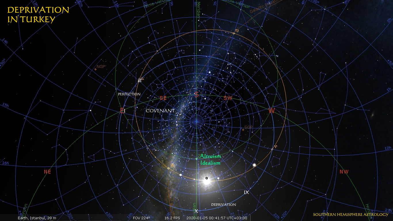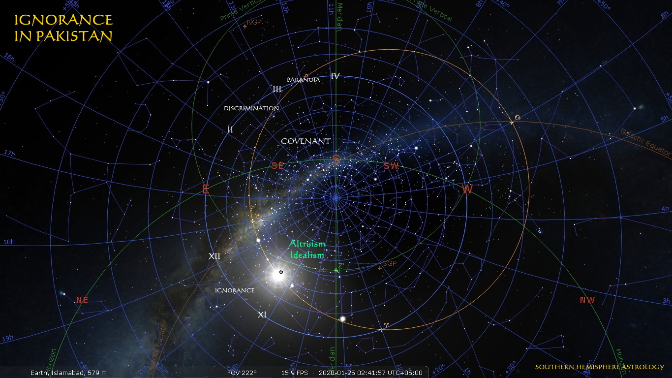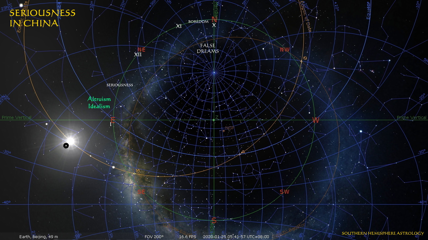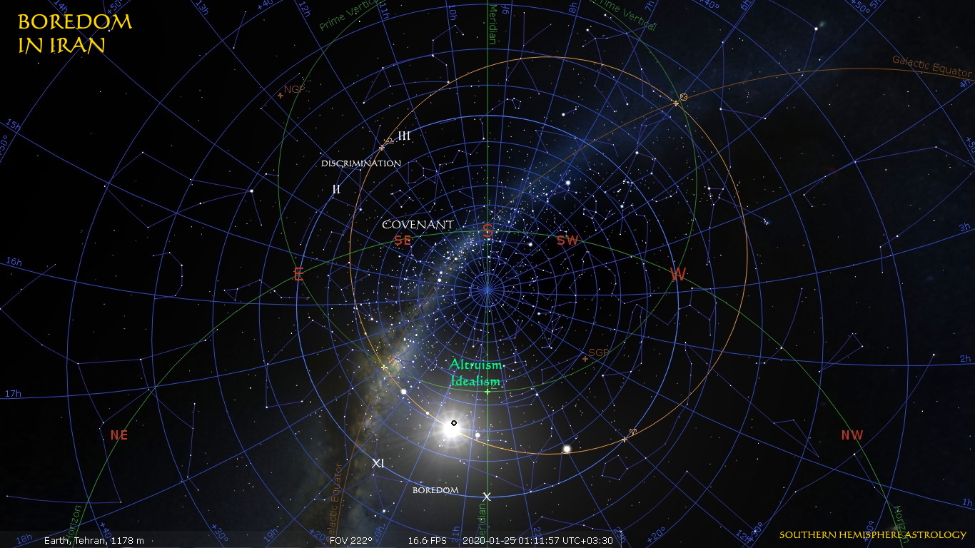 Let’s whizz to the moment in time, several hours before Townsville noon, customarily identified by the Academy of Scientific Astrology and the Uniting Church of Oncology, Climatology, Astrometry and Extragalactic Dynamics as New Moon. So here we are, ready to argue about signs and influences, but suddenly aware that the only thing we know for certain is that we know nothing. It may or may not be the case that this is not a dream, that the underworld is the outside looking in, or that the many mansions of my Father’s house are the wards of a detention centre’s psychiatric hospital, the hours which mark the various ways the autonomous spirit of everything gasps for survival under the putrefaction of my corpse, or the seams of my resistance to the emptiness of consciousness, time and illness. The following relativities of geography, Milky Way mythology and rotational orientation may or may not be helpful in sustaining the dialogue you might have with the Moon this year. [They are all plotted using Stellarium 0.19.2 and paint.net 4.2.7.]
