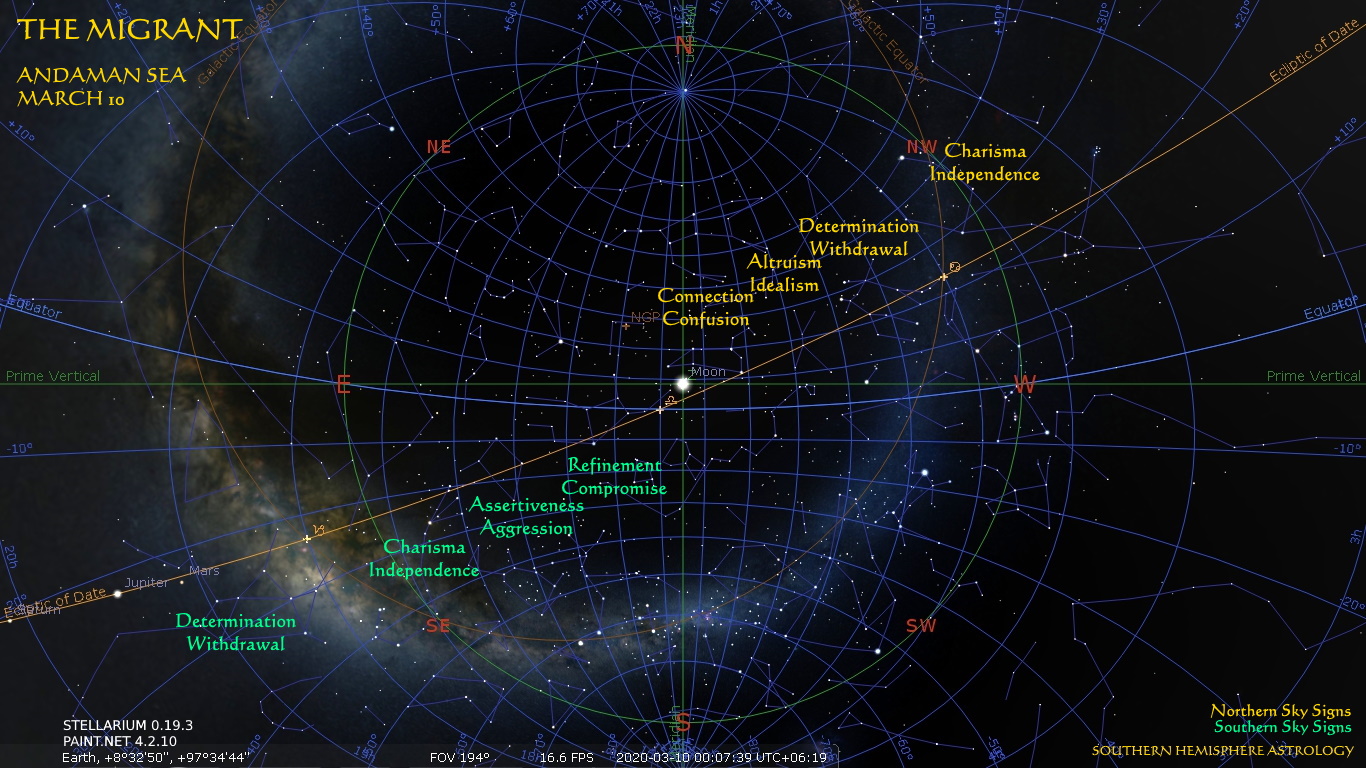 And so let us reconsider the punctuation of the New Moon, initially from the Migrant’s vantage-point. If the Sun were truly the parent and the Moon its chick, both would be observing the Earth as though the Sun were illuminating it from behind the Moon with the express purpose of lighting the way. So beware little chick so accustomed to dependency and unadapted to change: your parent is behind you, and you are about to discover the imperative of flight! When you come back, you will be someone else: parents never tell you that! Get your bearings!