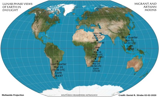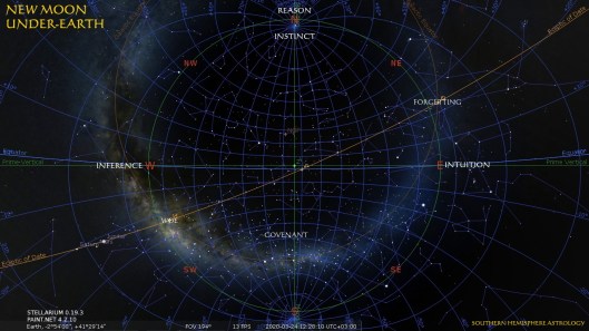 And so let us reconsider the punctuation of the New Moon, initially from the Migrant’s vantage-point. If the Sun were truly the parent and the Moon its chick, both would be observing the Earth as though the Sun were illuminating it from behind the Moon with the express purpose of lighting the way. So beware little chick so accustomed to dependency and unadapted to change: your parent is behind you, and you are about to discover the imperative of flight! When you come back, you will be someone else: parents never tell you that! Get your bearings!