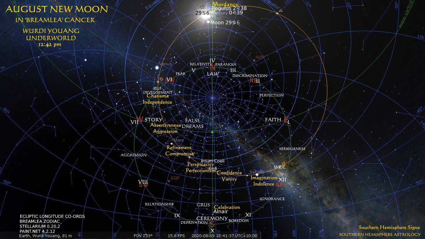 The cusp of Leo: connection and disclosure, relativity and faith, altruism and irony. Regulus Gate: the heart of the lion and the anus of the possum, gratuitous, almost alien, postmark of a trivialized celebration of separate togetherness. Or perhaps it presents a simple gesture of togetherness comprising a ceremonious underworld revelation to sarcasm that its defences are less than fun? It is certainly pure coincidence, isn’t it, like all the star names and attributes I have invented, and for that matter, the entire corpus of astrology, though it prefer the term synchronicity?