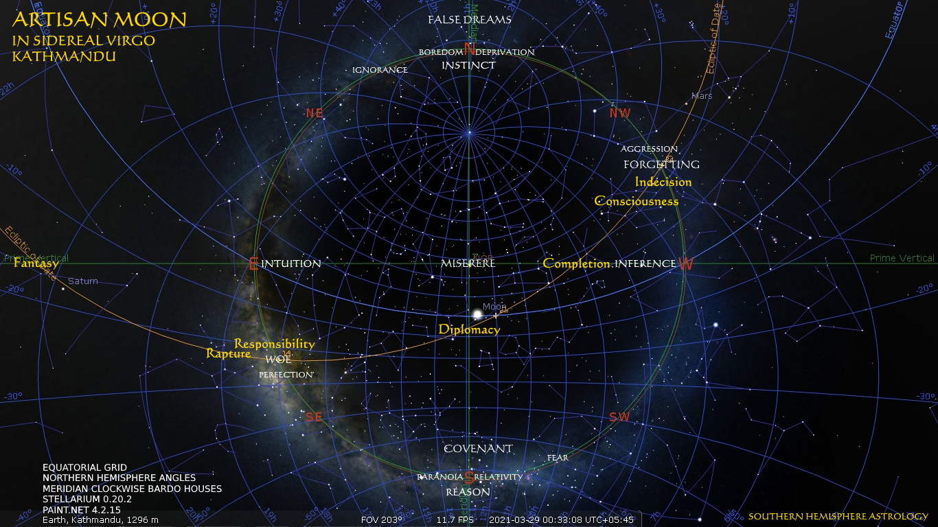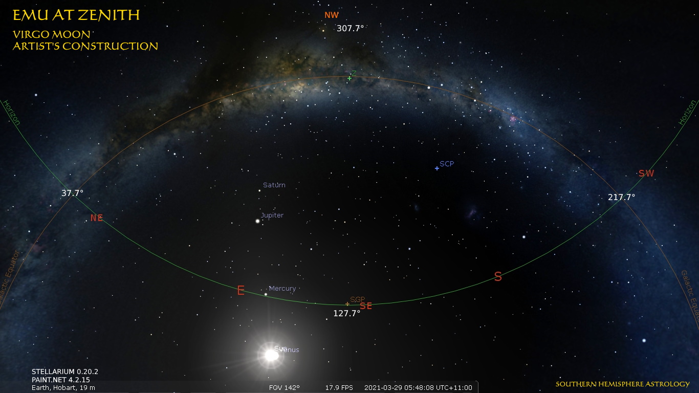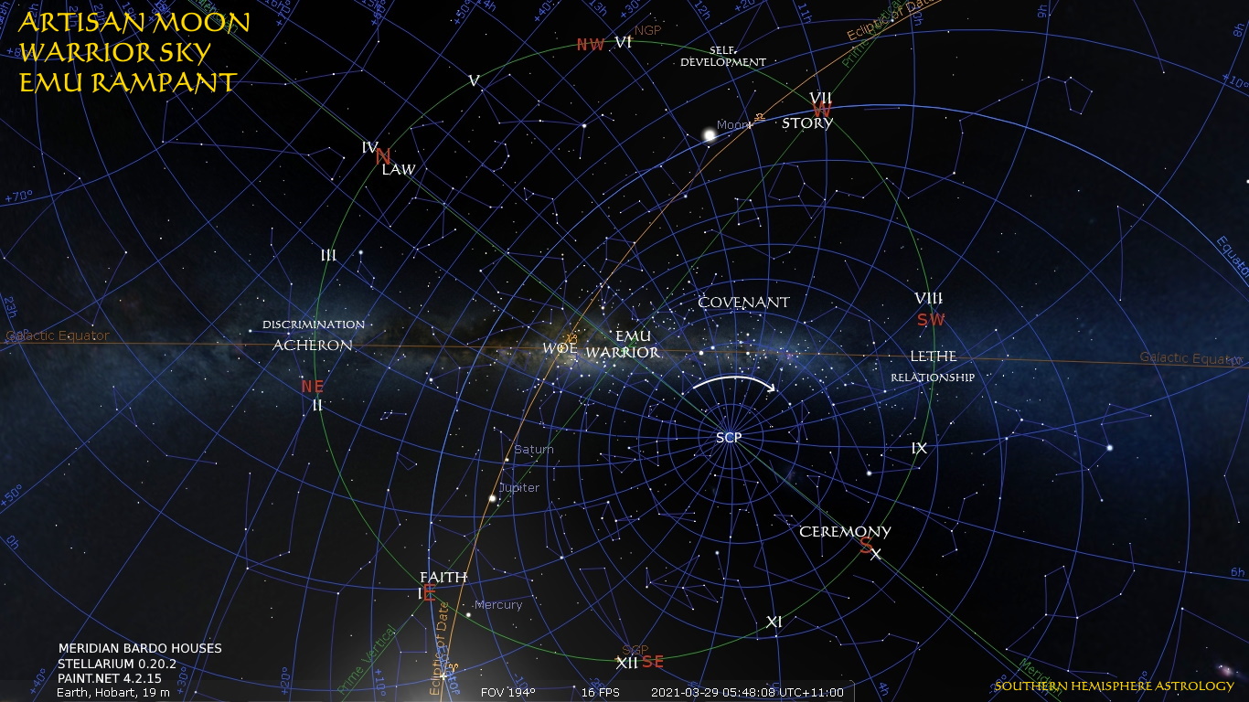Artisan Moon, Cartography, Convention, Covenant, Easter Moon, Emu, Full Moon, Miserere, Southern Hemisphere Zodiac, Stereographic Projection, Virgo Moon, Warrior