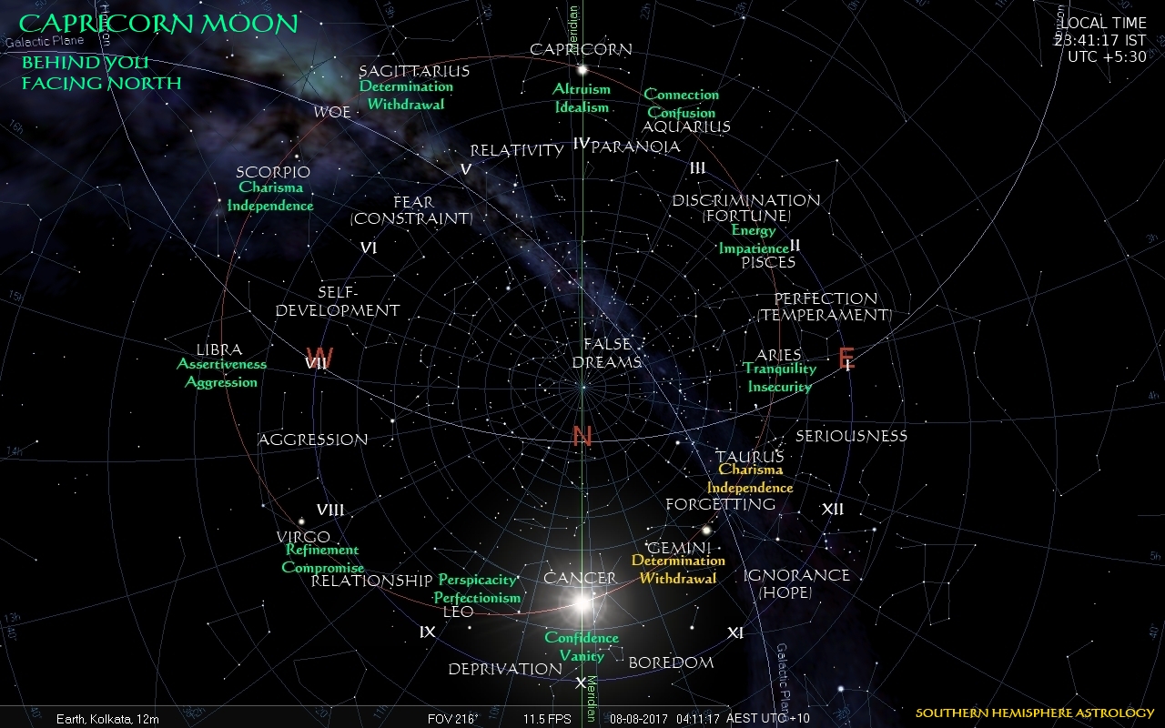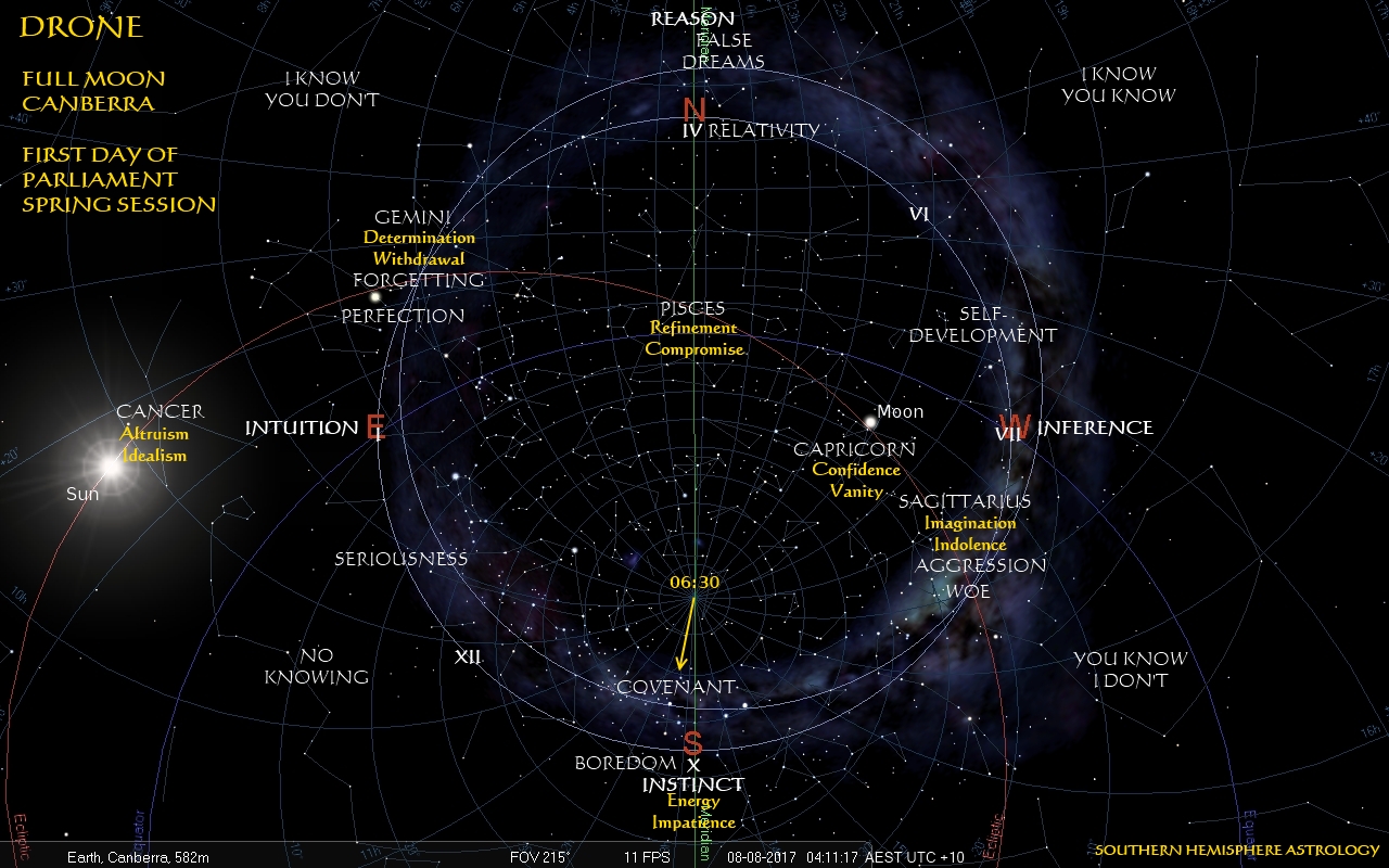 To this day, Capricorn in the Breamlea Zodiac continues to resonate with the concern for authenticity which is the hallmark of the present age. As a late summer constellation, a mansion the Southern Sun occupies from January to February, it carries the fifth Sign of Leonine confidence, but as the winter mansion of the Southern Full Moon it also carries the eleventh Sign of Aquarian altruism. It symbolizes our struggle with deceit, life making do with the subordination of care and the subterfuge of being. Gone is the Aquarian impulse to found a harmonious commune—the New Age has morphed into a therapy for addiction and dissent—and gone is the respectability of an inner life immersed in canons of literature and music. The techniques developing today are to affirm identity from hostile country, to give voice which overcomes noise, to colonise public space, to stop hiding, to dream the life, to think the body.