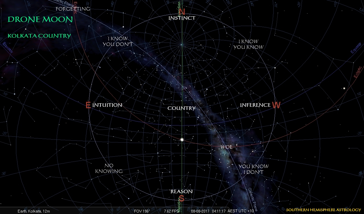 A drone is an unmanned aerial vehicle, like a satellite without responsibility for its own trajectory. The meanings we have given the Moon’s orbit derive not from its motion, which is straightforward, if subject to gravitational influences and historical violent collisions, but from our perspective. However, not only its elliptical orbit and the inclination of its orbit to Earth’s but their phenomena belong to the body of the world. The Moon’s angular distance from the ‘First Point of Aries’ and its deviation from the Ecliptic are real, and so is its apparent size and phase, though these are not its properties. The law which has always addressed and divided humans, punitive and often aggressive and cruel, is real in the same way. Its initiates are drones; it is inherent in country as a phenomenon, not a property. Country is the body of the world we are made of as we perceive it, or rather create it with our perception and account of ourselves.