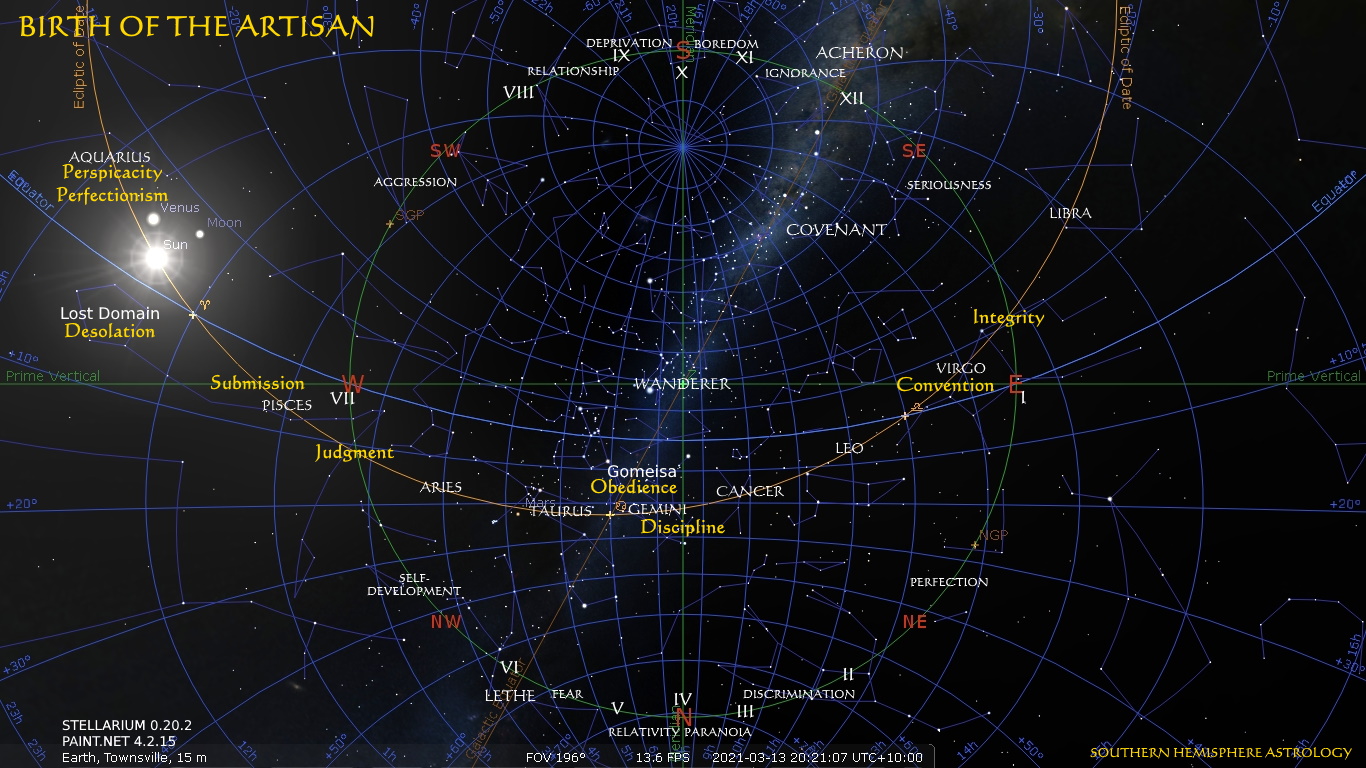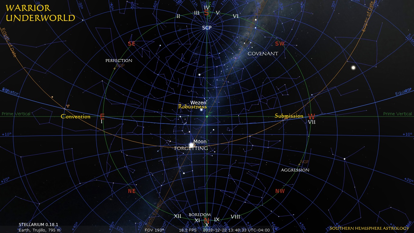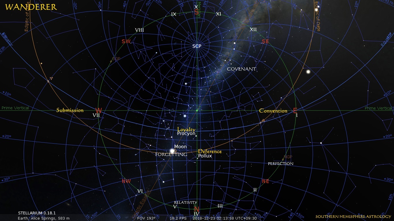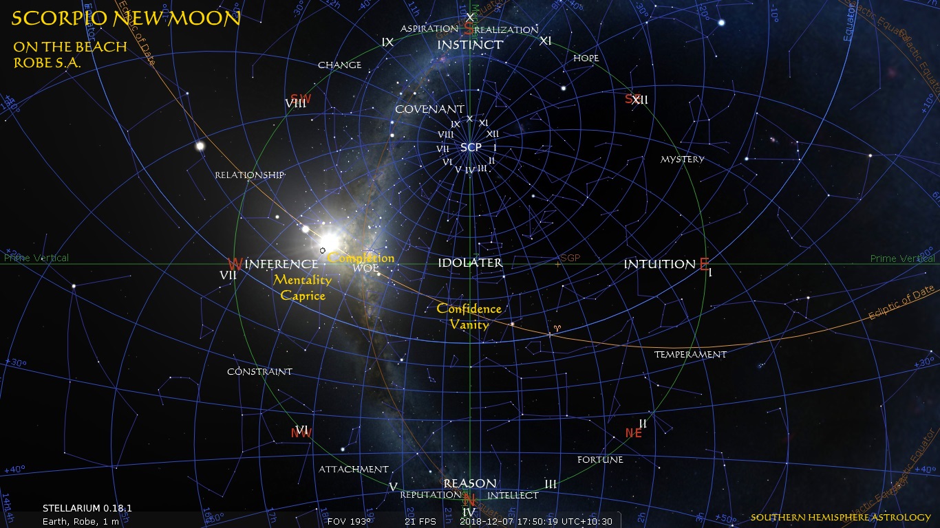 One person’s instinct is another’s reason. As previously explored, the alignment of the ancestors in a straight line passing directly overhead has two configurations: one associated by indigenous custom with the mystery of male initiation, and the other labelled idiosyncratically as the Wanderer, a possible celebration of gender difference locked into the progressive possibilities of iconoclasm emerging from the Underworld River of Lethe. Perhaps this moment, visible in complete darkness in the first quarter of the year, might be the birth of a New Moon with a difference, deriving his trajectory not from Goddess worship, but from self-worship among the ambiguous roots of identity in the somatic soup of retrospection.