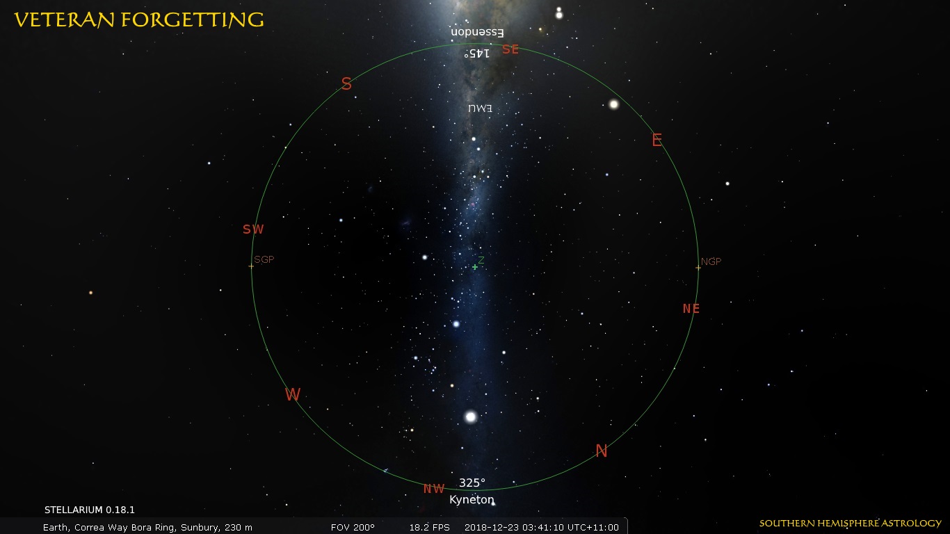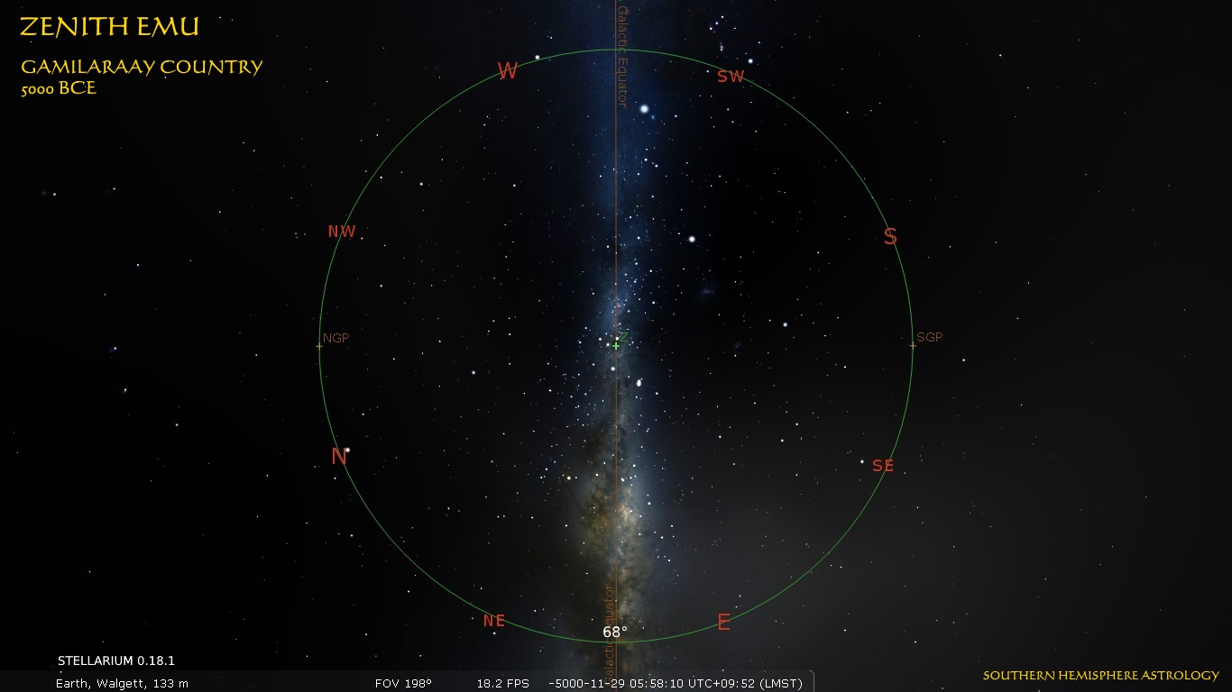 Down my way, at the Wurdi Youang stone circle, this occurred in approximately 5815 and 3190 BCE (as contemporaneously it did upside down in Copper Age Anatolia and Peloponnese Greece), according to Stellarium‘s algorithms, and during the intervening millennia the Emu was never precisely vertical. The NGP crossed the Meridian below the horizon and the SGP was circumpolar. It is possible that ‘near enough is good enough’ originated in Southern Australia (or Turkey, or Greece), but it is also just possible the Kulin nation occupied the locus for a sanctification of the Prime Vertical, the invention of the plumb bob or the transmogrification of masculinity.