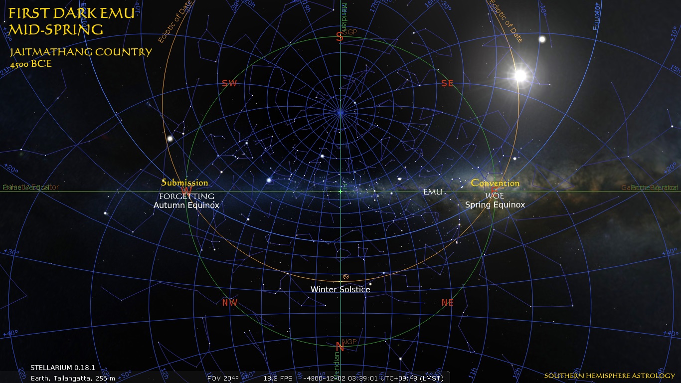 You should be familiar with the Emu, but you may not know how its appearance has moved throughout the millennia. It has been remarked that evidence of the orientation of Bora grounds to the position of the Emu is largely to be found in Northern N.S.W. and Queensland, a phenomenon which one day might enter the debate about continental vs. regional Indigenous culture. In the meantime, there seems to me a cogent explanation for the scarcity of such evidence south of the Murray, which has nothing to do with genocide or expropriation, and everything to do with locality.