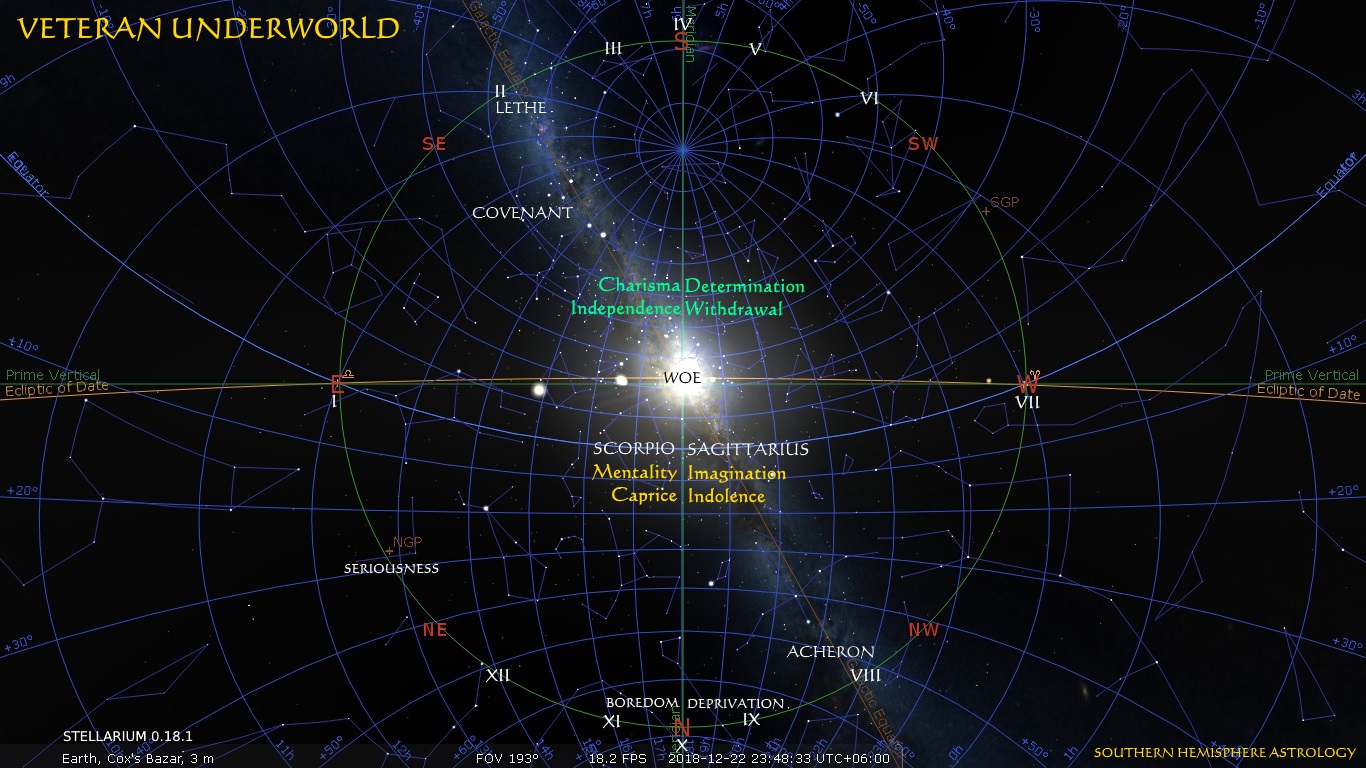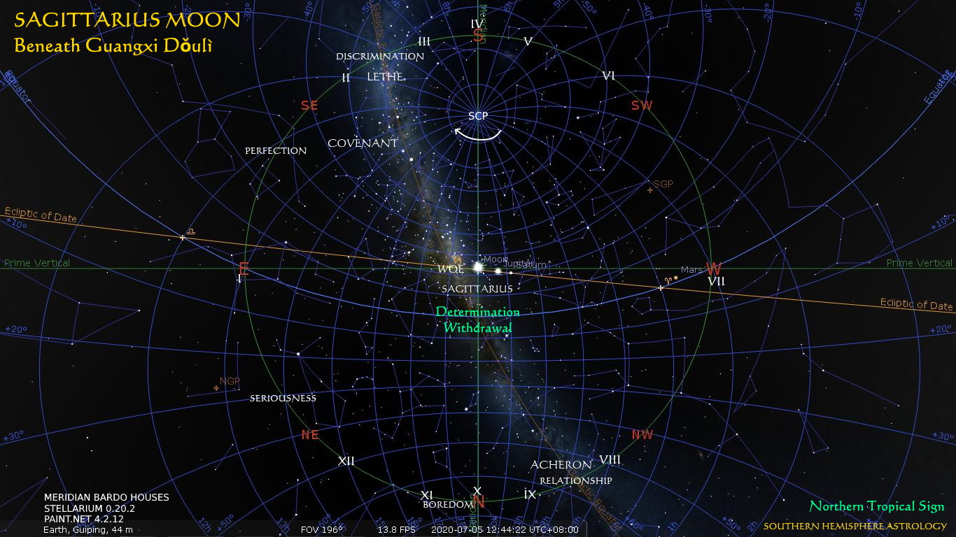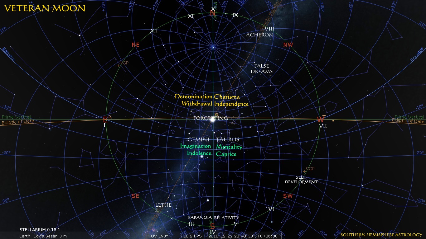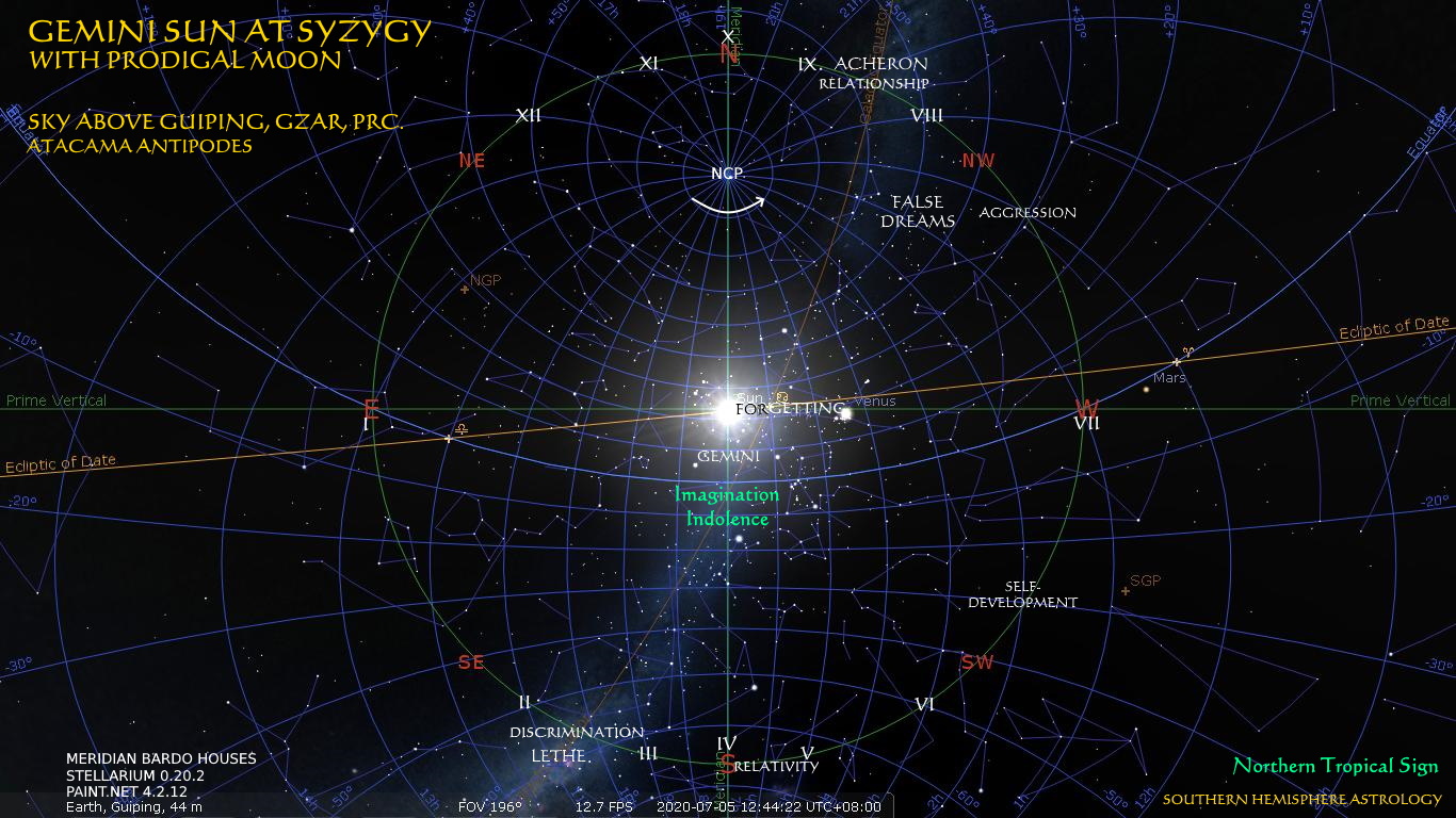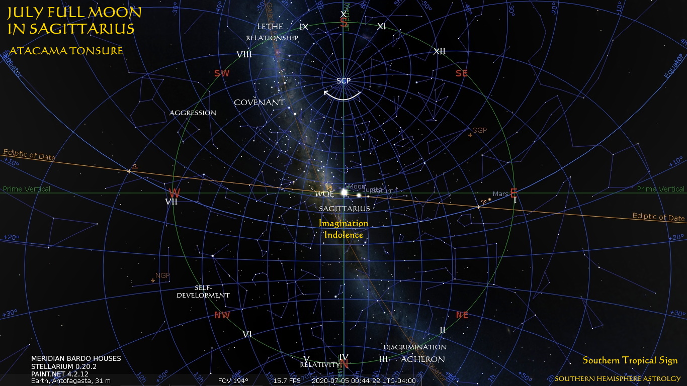 From the Lethe we dry off our responsibility; from responsibility we clothe care; care gives rise to anxiety; from anxiety comes being-toward-death in the effort to maintain buoyancy, the meaning of who we might be, as we flail across the Acheron to do quixotic battle with the denial of authenticity. And this drama is projected into the heavens above and below. Yes, we are made of water; yes, we go to water. The Full Moon of Sagittarius is hidden in the sack of the Sun and Earth in Gemini as a sublimated knot of anger and hurt, a recurrent nightmare, a hard-wired secret, an unexpiated unkindness, a solvent of lust and revenge: the germinating seed of an Elm rattling to be festooned with False Dreams at the gates of Utopia.