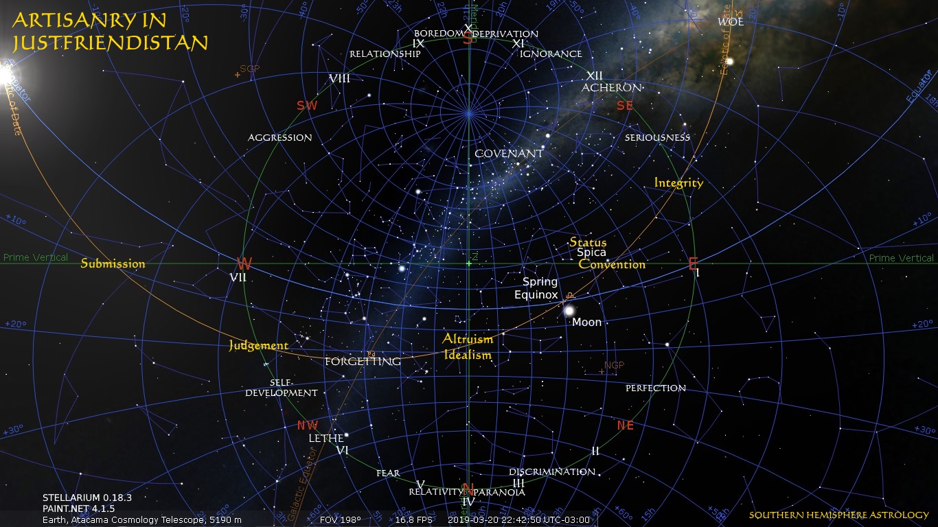 What is the craft of any artisan? Perfection! An emergent autonomy nurtured by the great oath of the gods that healing may be enjoyed, craftspersonship is the very apotheosis of enjoyable healing, the Covenant of the Styx itself. When the Southern Cross is at its highest in the South, for those blessed by atmospheres in which the splendid design of Crux’s background in the Milky Way is revealed, arcing from due east to due west, the keystone of perfection locks into place. (I feel such compassion for the perfectionists north of the tropics who are denied this denouement! How do you manage?)