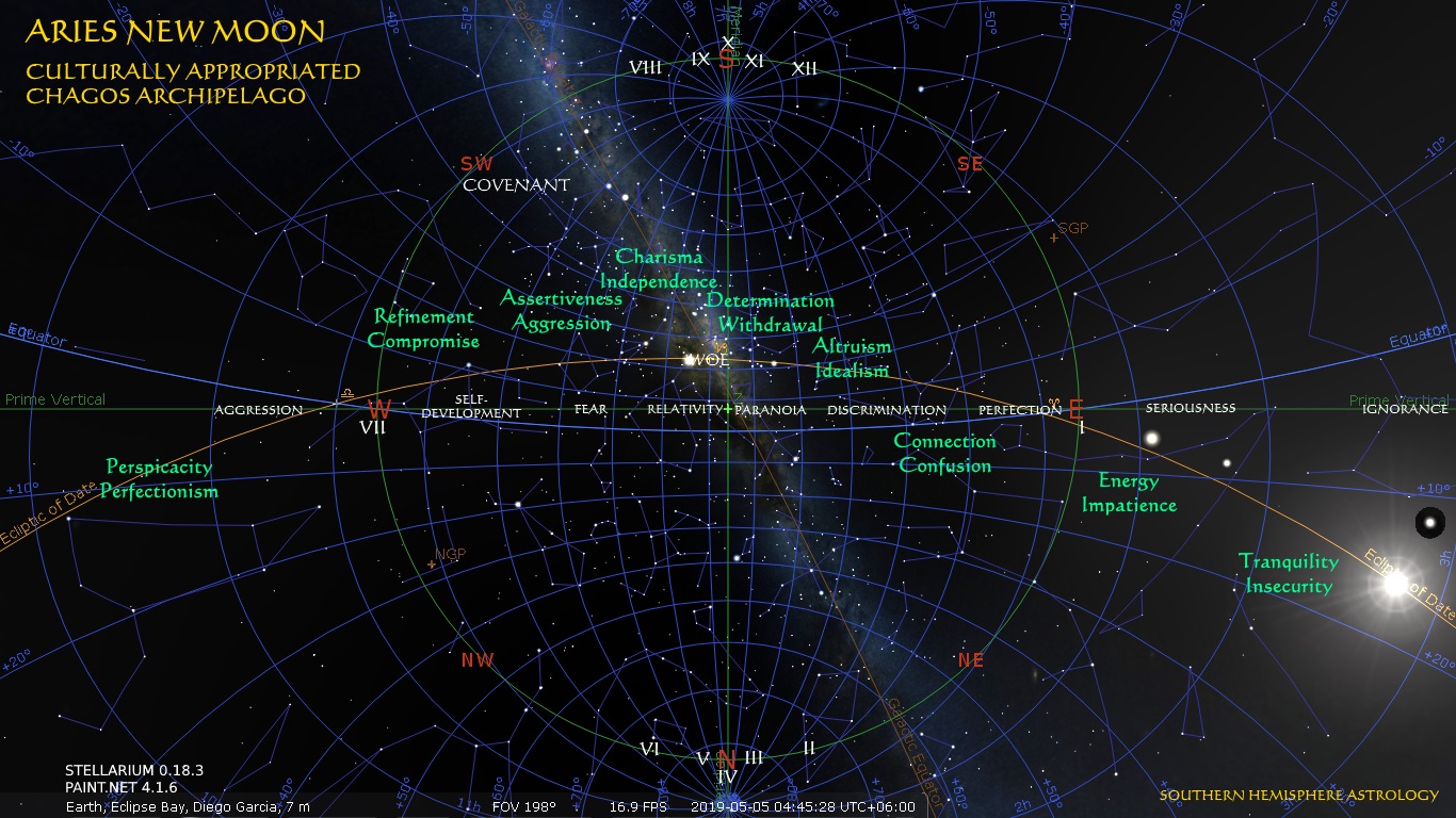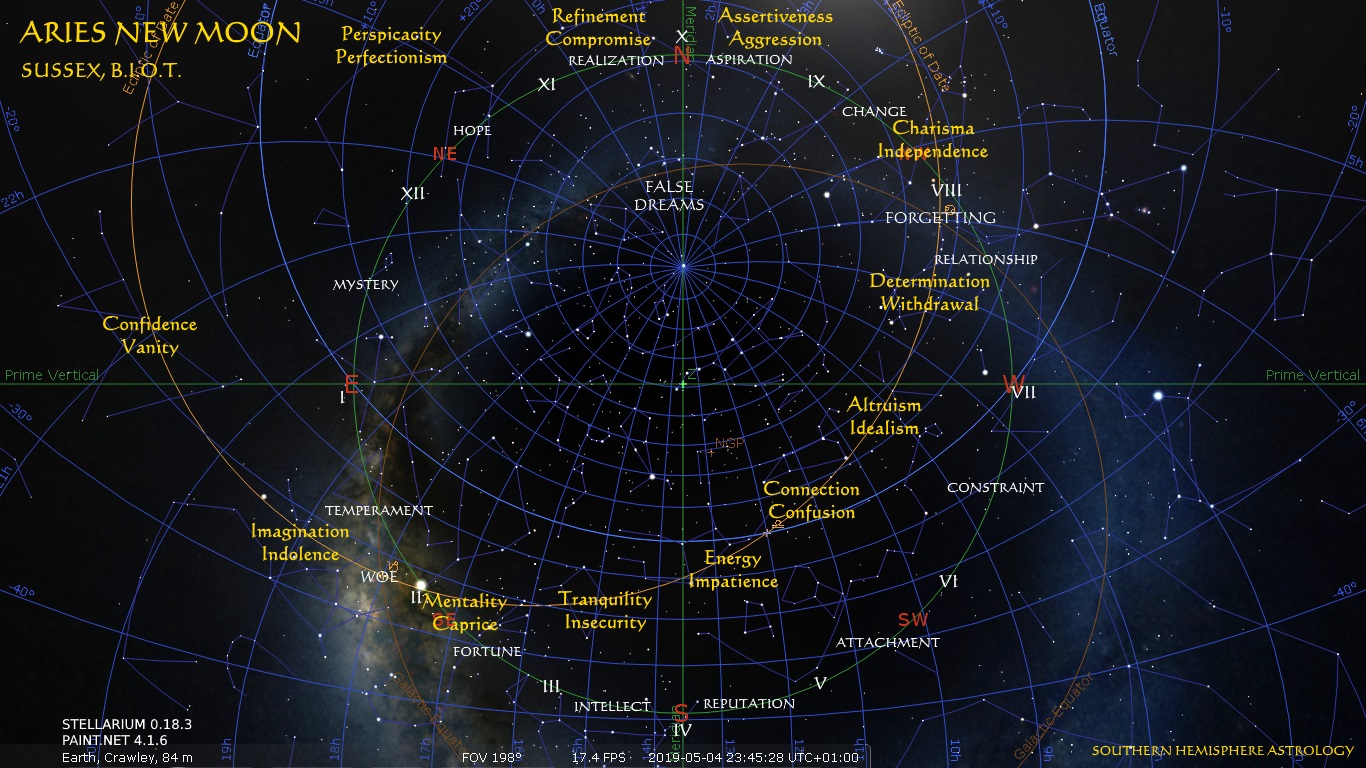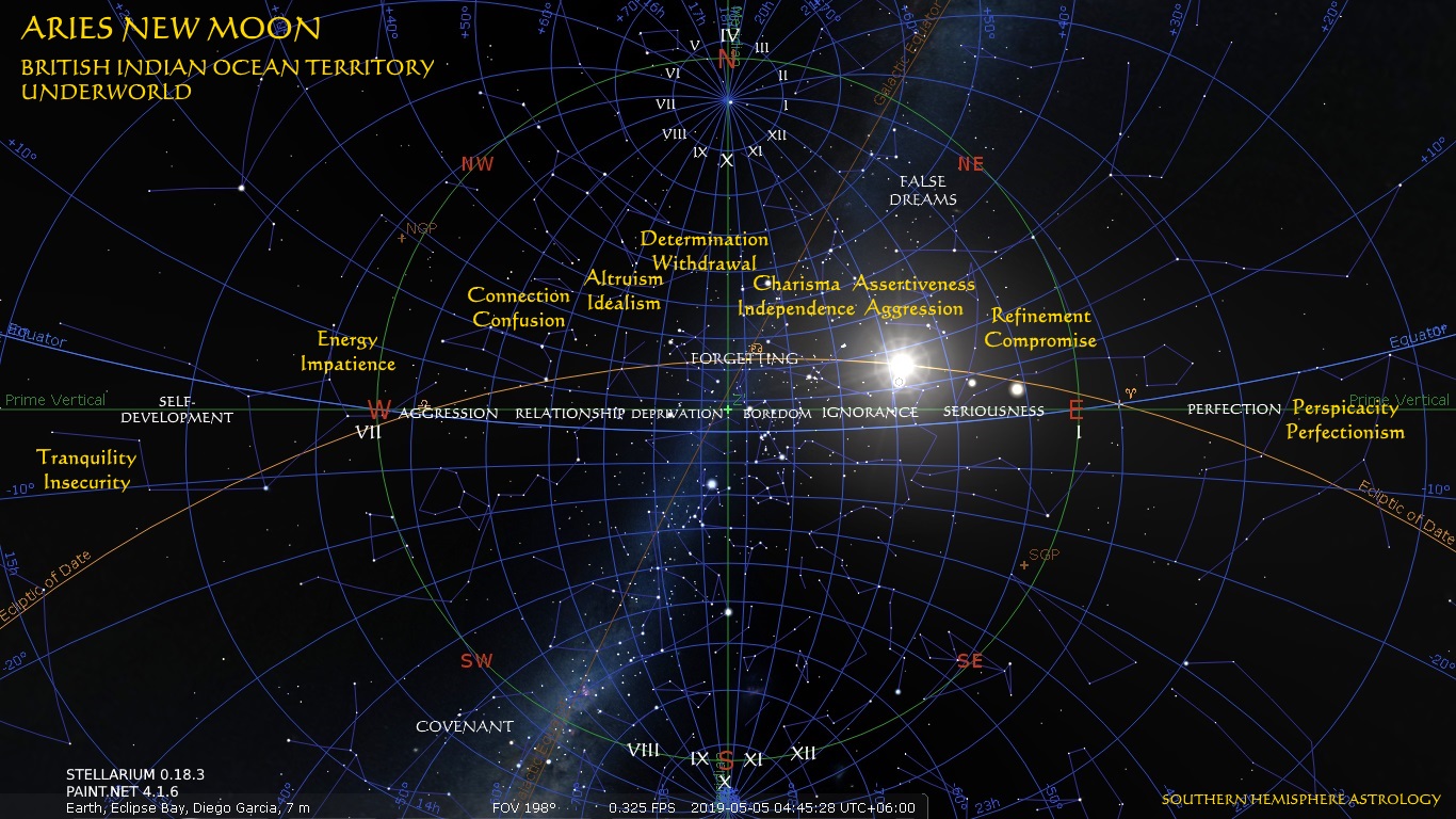 The first sign of the Northern Hemisphere Zodiac is like a tree in a wood you can only pick out from the air. It definitely has an identity, but what does that mean to the hiker who can only see the wood? The Northward Equinox, known to navigators as the First Point of Aries, is this year a shrinking 8.1° E along the Ecliptic from the westerly IAU boundary of Pisces, and today’s syzygy occurs 44.2° from the Equinox (roughly 44 days), and therefore 14.2° into the Northern Tropical Sign of Taurus, but obviously not the Bull we see, which was still visible last night on the western horizon an hour after sunset. So in the North you have a brace of fish smelling like a ram, followed by a restive ram chewing his cud. In the South, on the assumption Northern seasons can be simply turned upside-down, we have a haggling over the fish on the scales, followed by a ram trying to temper his assertiveness to mask a scorpion’s aggression.