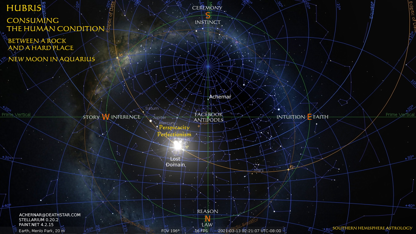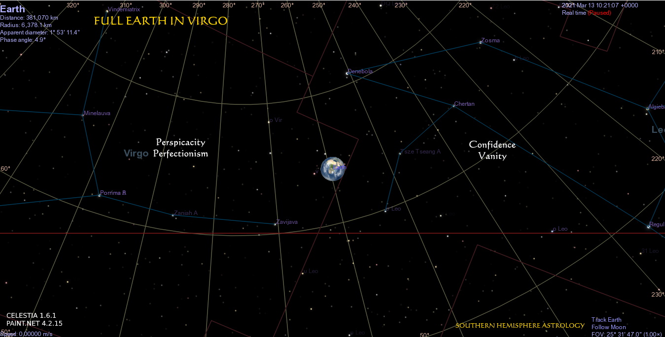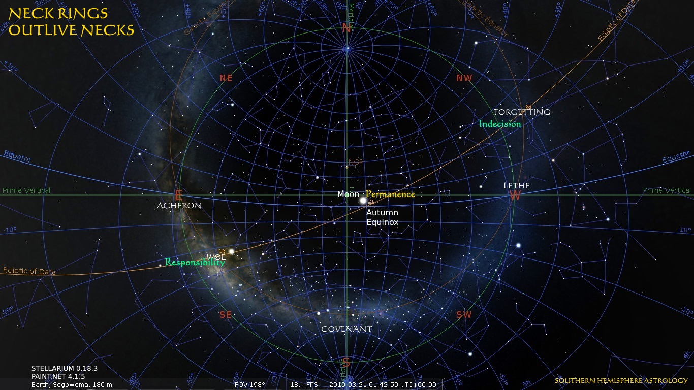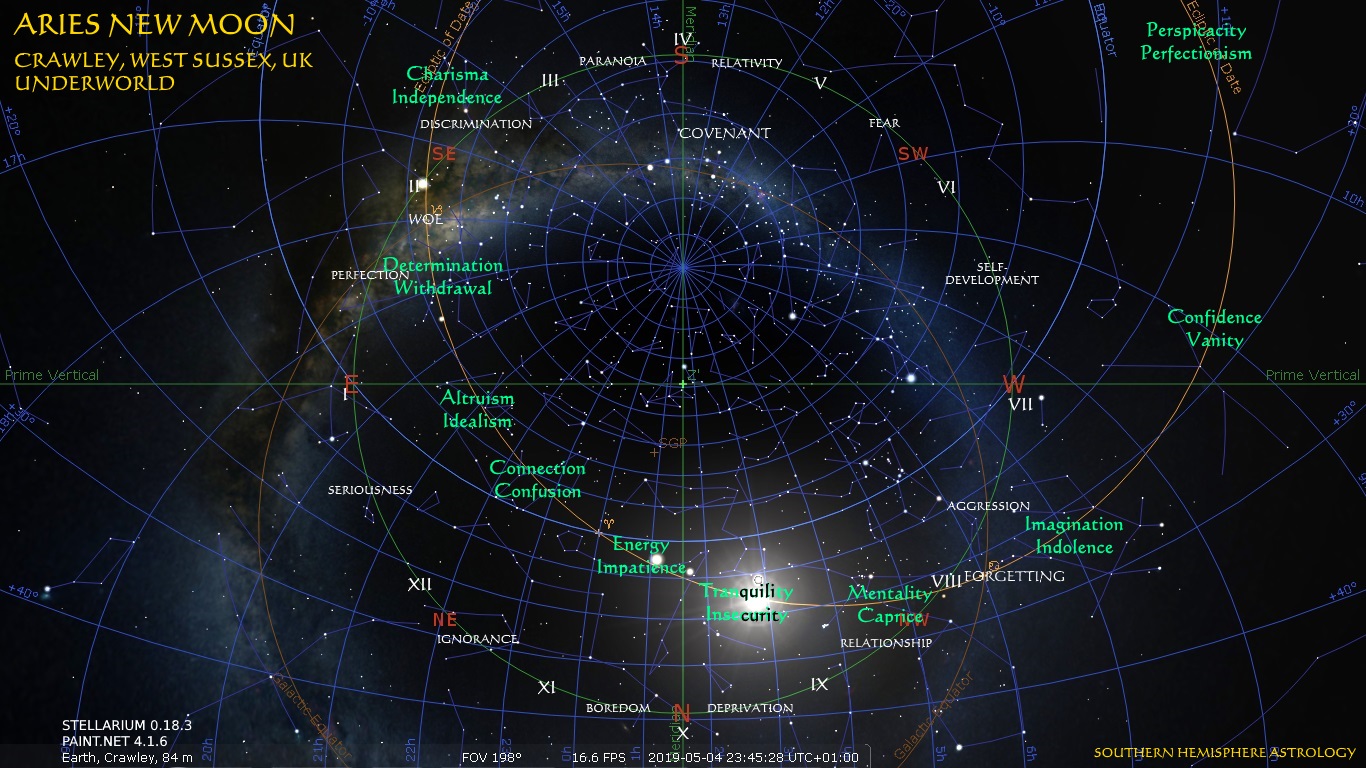The first sign of the Northern Hemisphere Zodiac is like a tree in a wood you can only pick out from the air. It definitely has an identity, but what does that mean to the hiker who can only see the wood? The Northward Equinox, known to navigators as the First Point of Aries, is this year a shrinking 8.1° E along the Ecliptic from the westerly IAU boundary of Pisces, and today’s syzygy occurs 44.2° from the Equinox (roughly 44 days), and therefore 14.2° into the Northern Tropical Sign of Taurus, but obviously not the Bull we see, which was still visible last night on the western horizon an hour after sunset. So in the North you have a brace of fish smelling like a ram, followed by a restive ram chewing his cud. In the South, on the assumption Northern seasons can be simply turned upside-down, we have a haggling over the fish on the scales, followed by a ram trying to temper his assertiveness to mask a scorpion’s aggression.